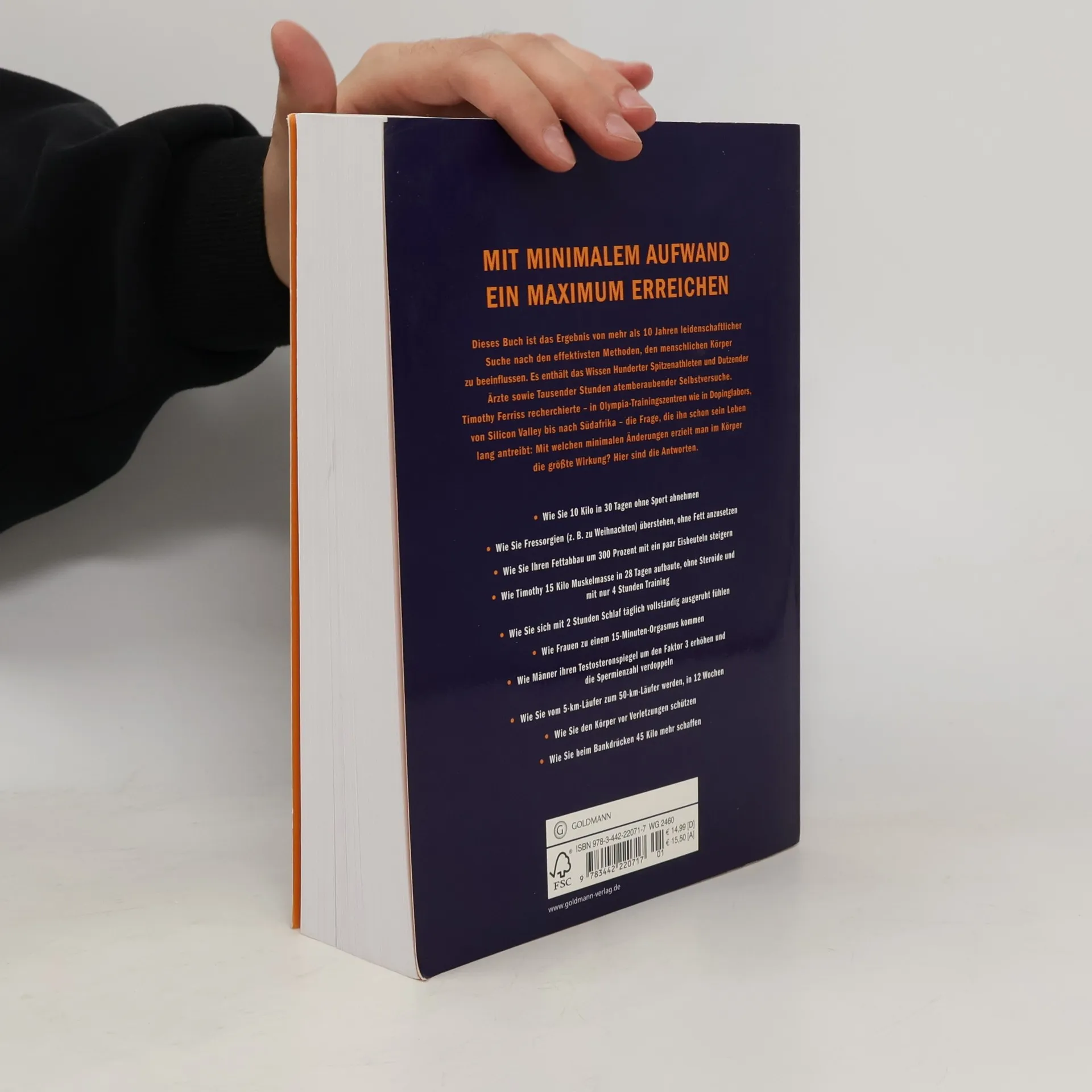 Die Glaubenssätze von Millionen Diätessern, Bodybuildern und Trainingsfreaks sehen plötzlich alt aus „Zu dick“, „nicht muskulös genug“, „keine Ausdauer“ – Unzufriedenheit mit dem eigenen Körper ist weit verbreitet und leider oft berechtigt. Viele Abnehmtipps fruchten jedoch nicht und enden in Resignation. Wer nur auf die Willenskraft und Leidensbereitschaft seiner Leser baut, scheitert in aller Regel. Deswegen lautet das Motto von Timothy Ferriss: Smart abnehmen und effizient trainieren. Lernen Sie, welche minimalen Maßnahmen ein Maximum an Ergebnissen bringen – durch präzise Informationen über die Funktionsweise unseres Körpers und praktische Schritt-für-Schritt-Anleitungen! Nicht bloß ein weiteres Buch über das Abnehmen, sondern das umfassende Aufbau- und Verschönerungsprogramm für ihren Körper. Ideal für alle, die wenig Zeit haben, aber viel erreichen wollen – und auf wen trifft das nicht zu?