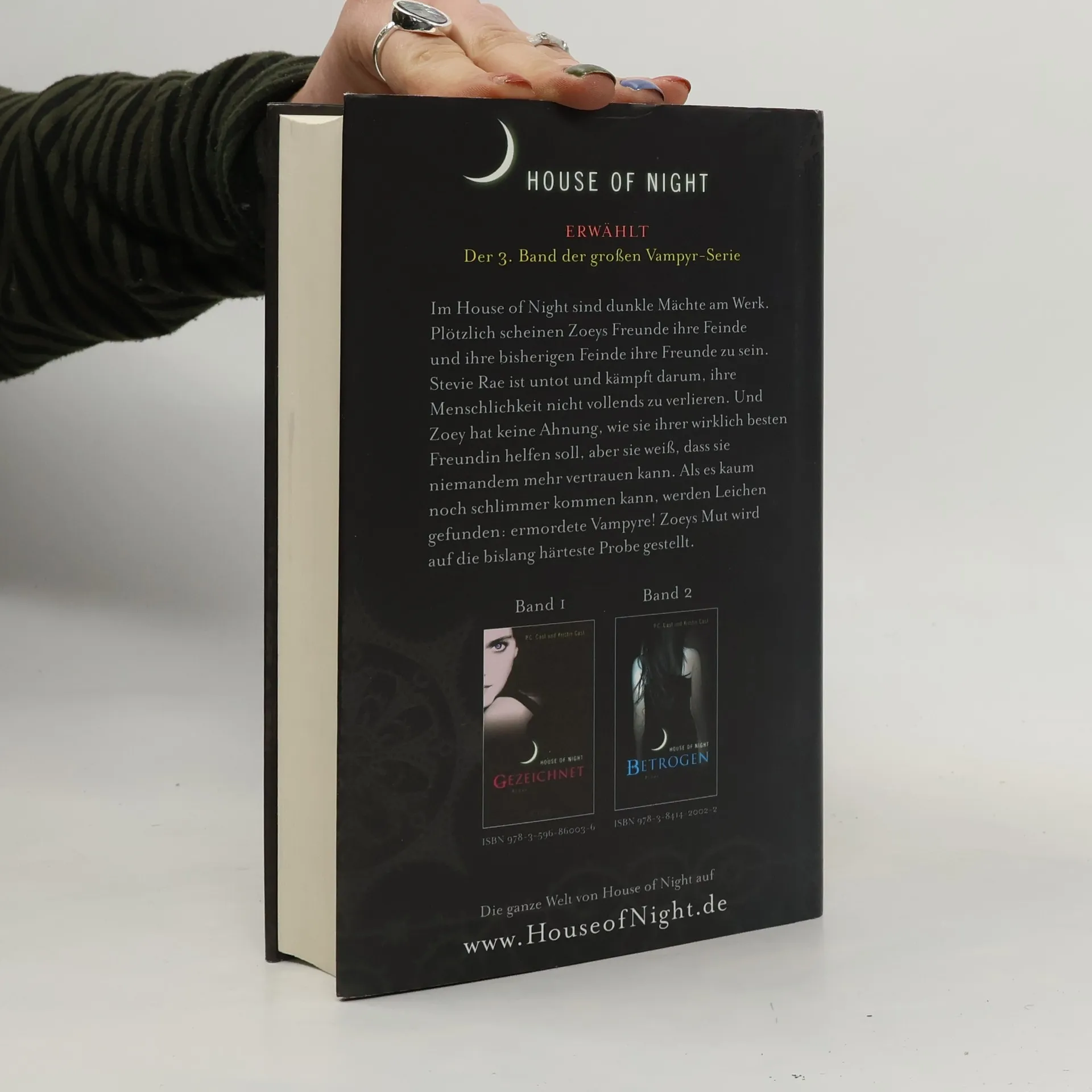 House of Night ERWÄHLTDer 3. Band der großen Vampyr-Serie. Dunkle Mächte sind im House of Night am Werk und Zoeys Erlebnisse im Internat nehmen eine rätselhafte Wendung. Zoeys beste Freundin Stevie Rae ist untot und versucht mit aller Macht, ihre Menschlichkeit nicht vollends zu verlieren. Und Zoey hat keine Ahnung, wie sie ihr dabei helfen kann, aber sie spürt, dass alles, was sie und Stevie Rae herausfinden vor den anderen im House of Night geheim gehalten werden muss. Denn plötzlich scheint es keinen mehr zu geben, dem sie wirklich vertrauen können. Als es kaum noch schlimmer kommen kann, werden Leichen gefunden: ermordete Vampyre! Aber Zoey findet heraus, dass nichts so ist wie es scheint… ERWÄHLT ist der dritte Band der House of Night- Serie, in der Zoey als Jungvampyrin auf die bislang härteste Probe gestellt wird.
