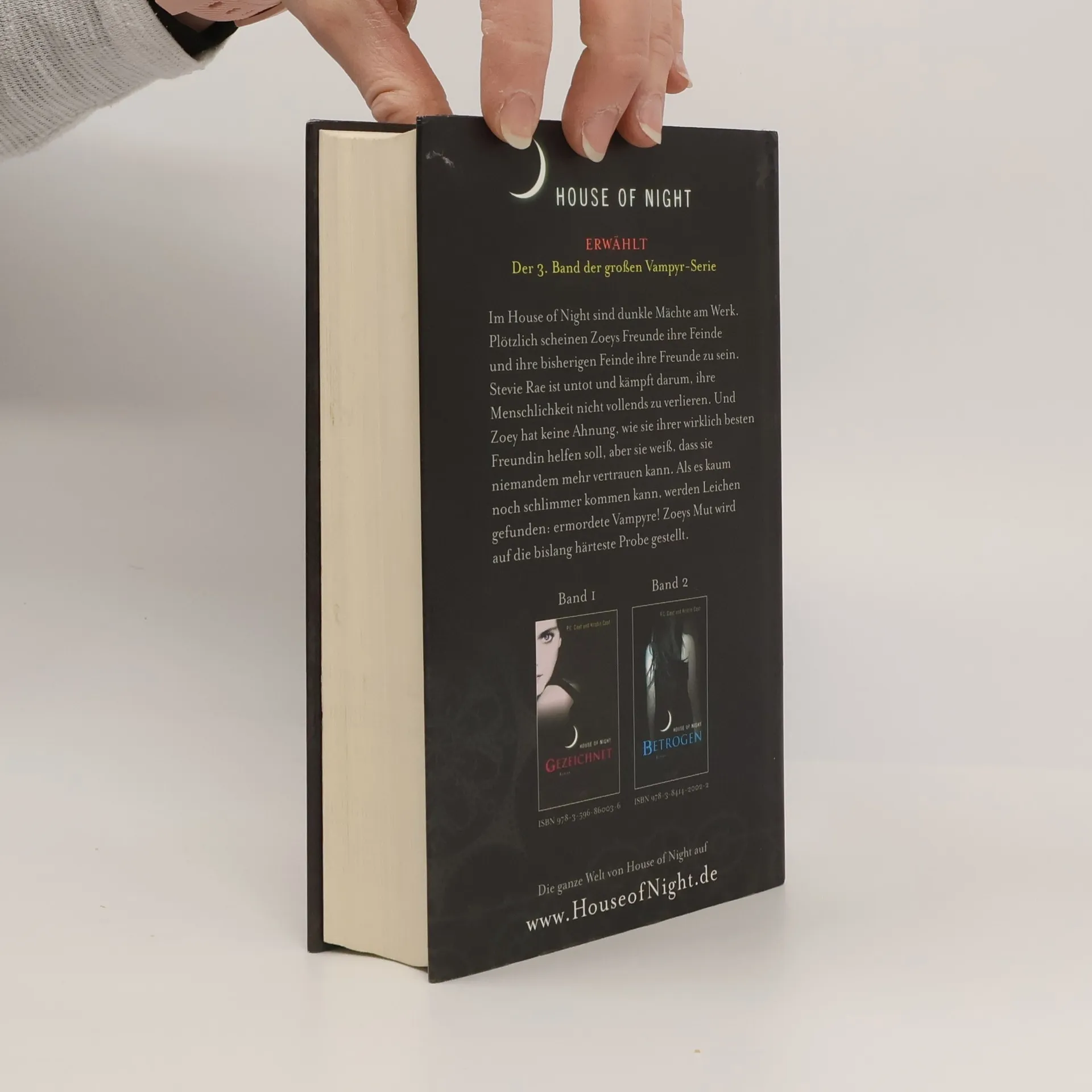 House of Night ERWÄHLTDer 3. Band der großen Vampyr-Serie. Dunkle Mächte sind im House of Night am Werk und Zoeys Erlebnisse im Internat nehmen eine rätselhafte Wendung. Zoeys beste Freundin Stevie Rae ist untot und versucht mit aller Macht, ihre Menschlichkeit nicht vollends zu verlieren. Und Zoey hat keine Ahnung, wie sie ihr dabei helfen kann, aber sie spürt, dass alles, was sie und Stevie Rae herausfinden vor den anderen im House of Night geheim gehalten werden muss. Denn plötzlich scheint es keinen mehr zu geben, dem sie wirklich vertrauen können. Als es kaum noch schlimmer kommen kann, werden Leichen gefunden: ermordete Vampyre! Aber Zoey findet heraus, dass nichts so ist wie es scheint… ERWÄHLT ist der dritte Band der House of Night- Serie, in der Zoey als Jungvampyrin auf die bislang härteste Probe gestellt wird.