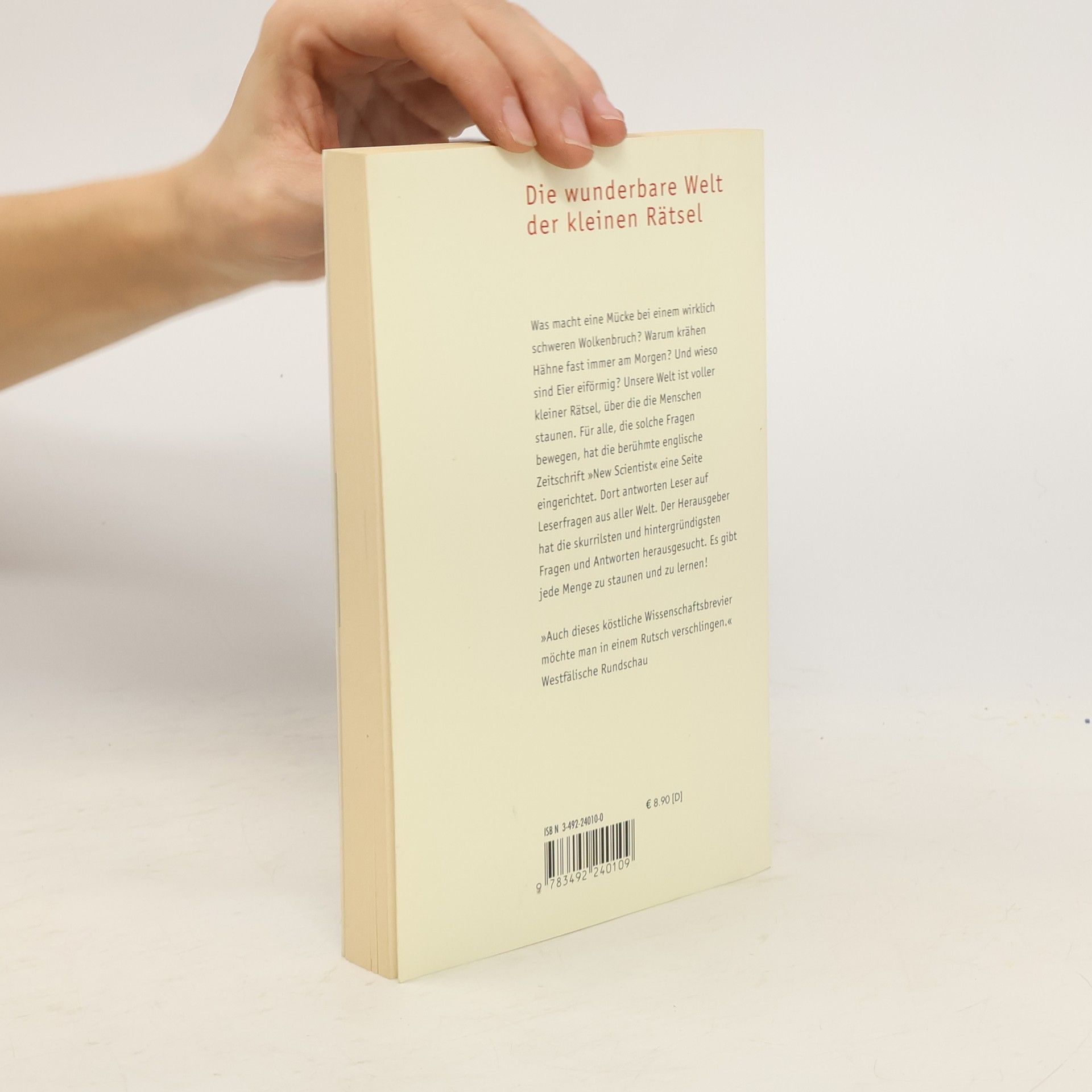 Was macht eine Mücke bei einem wirklich schweren Wolkenbruch? Warum krähen Hähne fast immer am Morgen? Und wieso sind Eier eiförmig? Unsere Welt ist voller kleiner Rätsel, über die die Menschen staunen. Für alle, die solche Fragen bewegen, hat die berühmte englische Zeitschrift "The Scientist" eine Seite eingerichtet. Dort antworten Leser auf Leserfragen aus aller Welt. Der Herausgeber hat die skurrilsten und hintergründigsten Fragen und Antworten herausgesucht. Es gibt jede Menge zu staunen und zu lernen!
