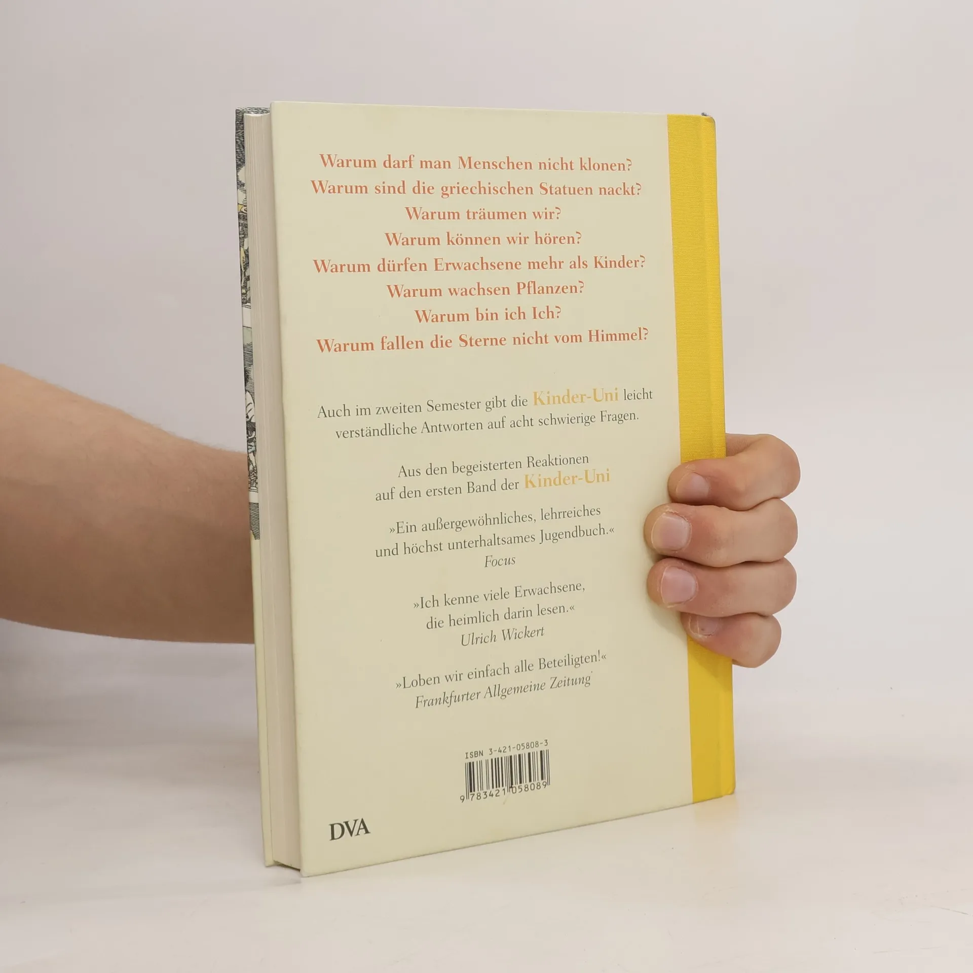 Nach dem ersten Band der Kinder-Uni, dem erfolgreichsten Kindersachbuch des Jahres 2003, erscheint nun der zweite. Wie der erste vermittelt er grundlegendes Wissen zu acht Themenbereichen. Fundiert, leicht verständlich und zauberhaft illustriert. So macht Lernen Spaß! Vorlesungsverzeichnis: • Warum darf man Menschen nicht klonen? • Warum sind griechische Statuen immer nackt? • Warum träumen wir? • Warum haben wir einen kleinen Mann im Ohr? • Warum dürfen Erwachsene mehr als Kinder? • Warum wachsen Pflanzen? • Warum bin ich Ich? • Warum fallen die Sterne nicht vom Himmel?