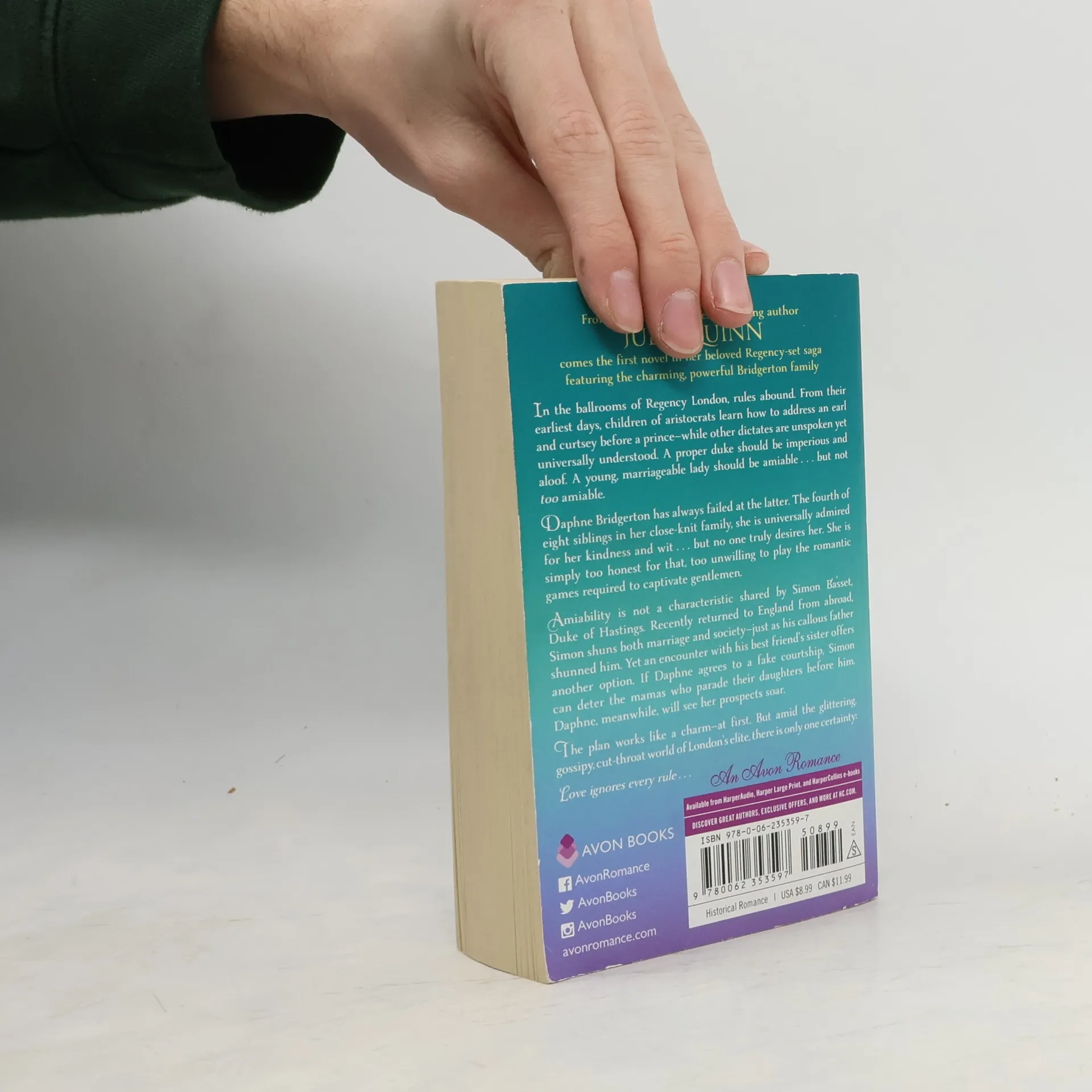 From #1 New York Times bestselling author Julia Quinn comes the first novel in her beloved Regency series featuring the charming Bridgerton family, soon to be a Netflix series. In the ballrooms of Regency London, strict social rules govern the lives of the aristocracy. Children learn the proper ways to address an earl or curtsey before a prince, while unspoken expectations loom large. A proper duke is expected to be aloof, and a marriageable lady should be amiable—but not too amiable. Daphne Bridgerton, the fourth of eight siblings, struggles with this balance. Well-liked for her kindness and wit, she finds that no one truly desires her, as her honesty keeps her from playing the romantic games that captivate gentlemen. Simon Basset, the Duke of Hastings, has returned to England determined to avoid marriage and society, having been emotionally scarred by his father's neglect. An unexpected encounter with Daphne, his best friend’s sister, leads to a proposal for a fake courtship. This arrangement allows Simon to fend off the matchmaking mamas, while boosting Daphne’s prospects and reputation. Initially, the plan works perfectly, but in the glittering, gossipy world of London’s elite, love proves to be a force that disregards all rules.