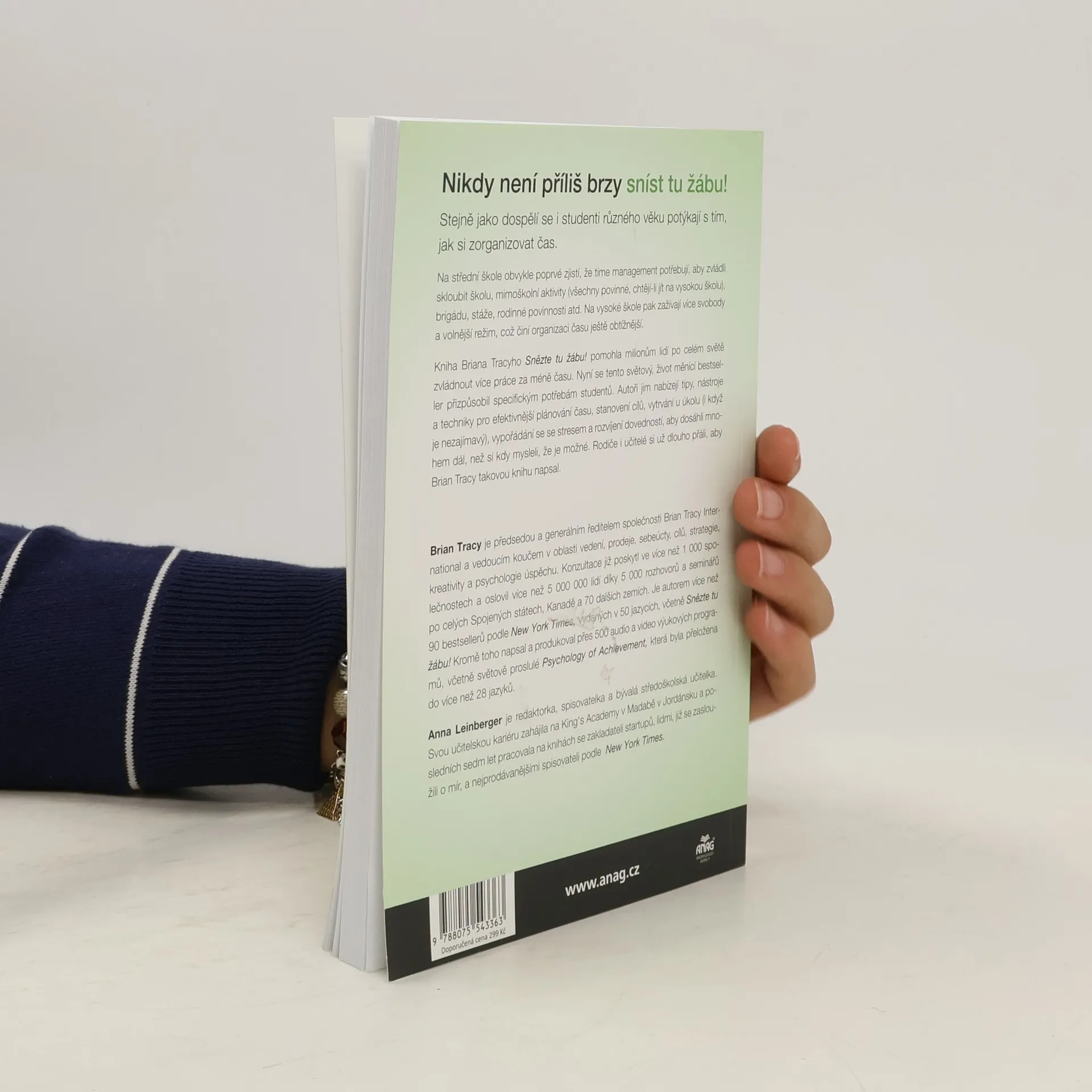 Stejně jako dospělí se i studenti různého věku potýkají s tím, jak si zorganizovat čas. Na střední škole obvykle poprvé zjistí, že time management potřebují, aby zvládli skloubit školu, mimoškolní aktivity (všechny povinné, chtějí-li jít na vysokou školu), brigádu, stáže, rodinné povinnosti atd. Na vysoké škole pak zažívají více svobody a volnější režim, což činí organizaci času ještě obtížnější. Kniha Briana Tracyho Snězte tu žábu! pomohla milionům lidí po celém světě zvládnout více práce za méně času. Nyní se tento světový, život měnící bestseller přizpůsobil specifickým potřebám studentů. Autoři jim nabízejí tipy, nástroje a techniky pro efektivnější plánování času, stanovení cílů, vytrvání u úkolu (i když je nezajímavý), vypořádání se se stresem a rozvíjení dovedností, aby dosáhli mnohem dál, než si kdy mysleli, že je možné. Rodiče i učitelé si už dlouho přáli, aby Brian Tracy takovou knihu napsal.