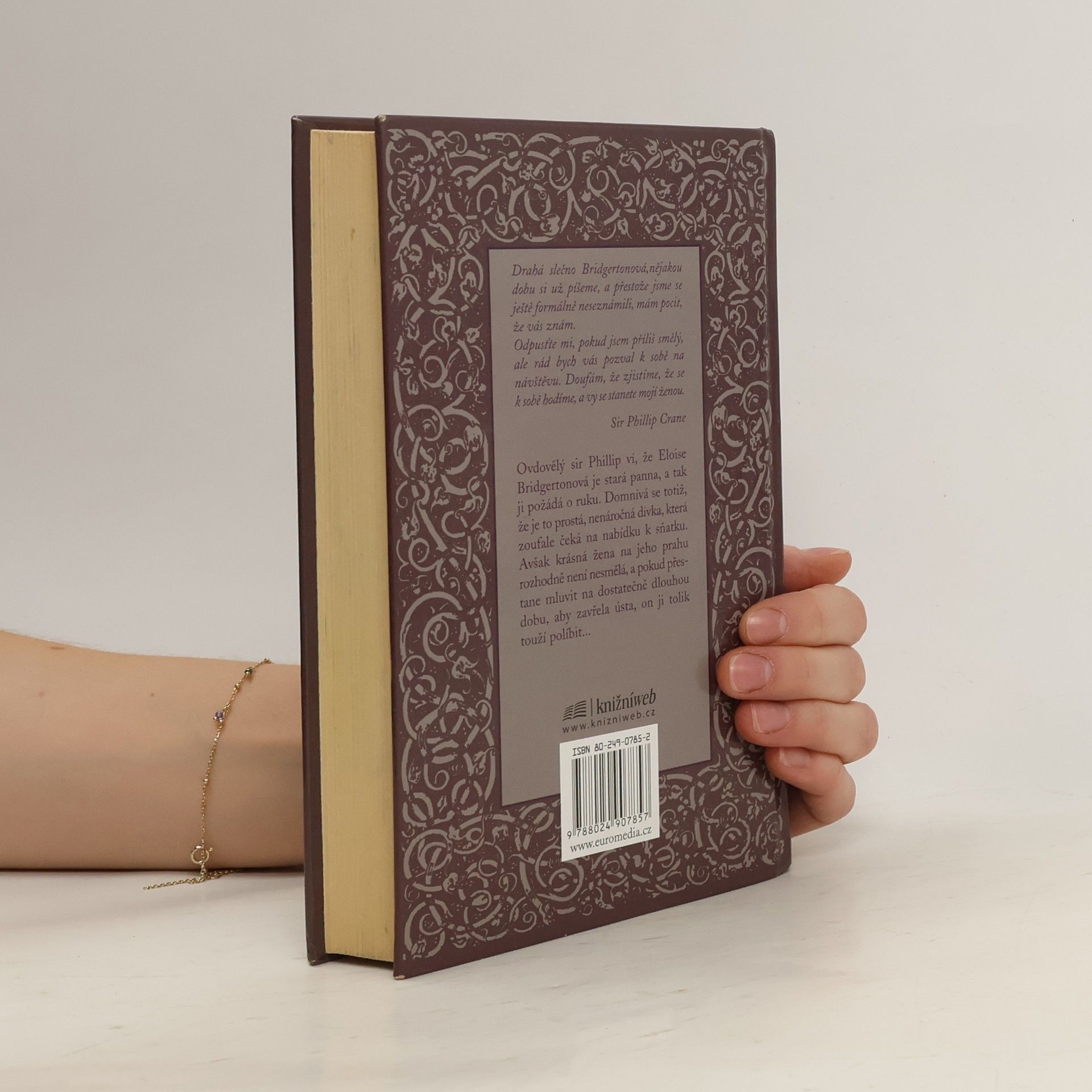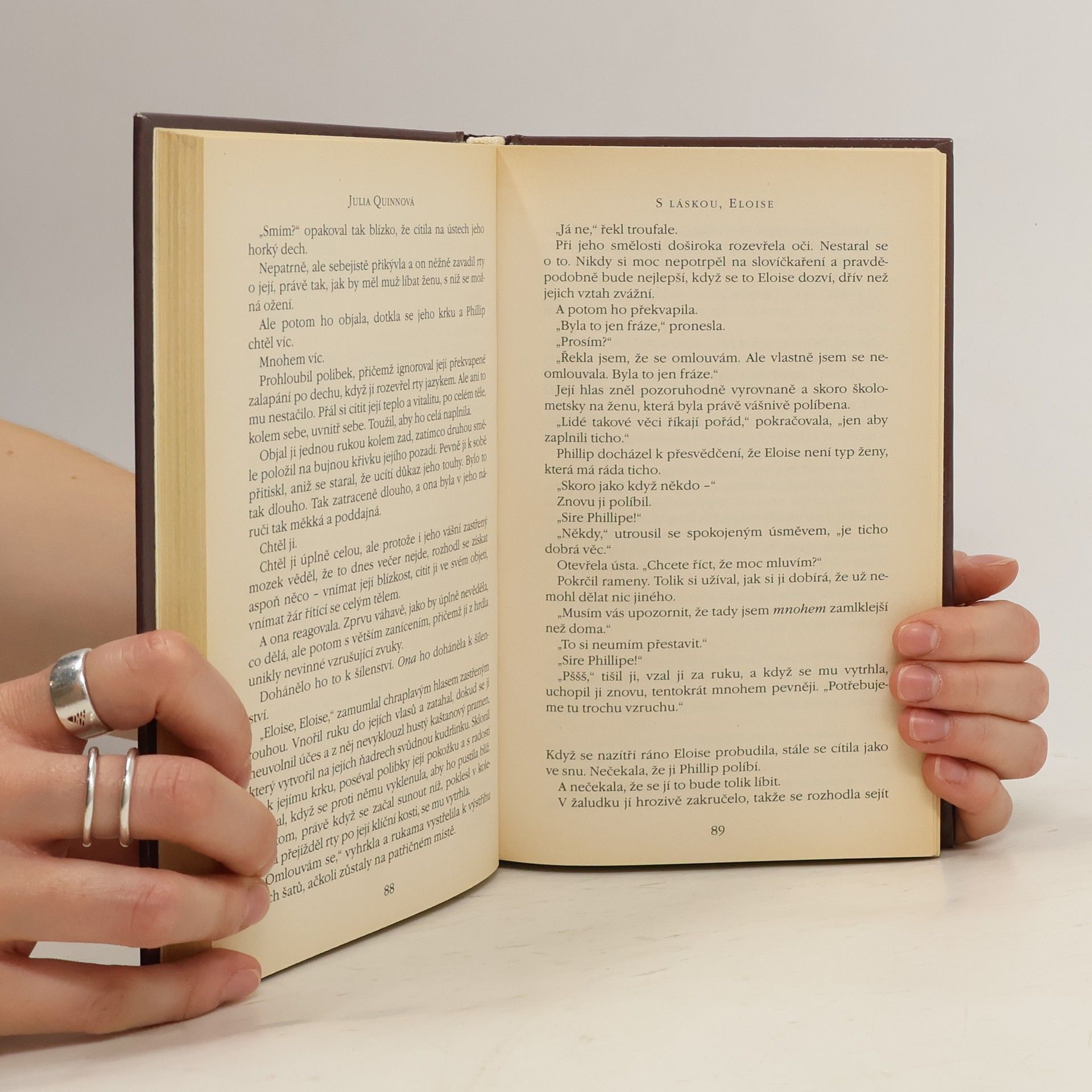 Rok 1824. Ovdovělý sir Phillip ví, že Eloise Bridgertonová je stará panna, a tak ji požádá o ruku. Domnívá se totiž, že je to prostá, nenáročná dívka, která zoufale čeká na nabídku k sňatku. Avšak krásná žena na jeho prahu rozhodně není nesmělá, a pokud přestane mluvit na dostatečně dlouhou dobu, aby zavřela ústa, on ji tolik touží políbit… To si myslí, že jí přeskočilo? Eloise Bridgertonová by se rozhodně neprovdala za muže, jehož nikdy neviděla! Ale potom začne přemýšlet… a pochybovat… a než pochopí, jak se to stalo, sedí uprostřed noci v pronajatém kočáru a jede za mužem, jenž, jak doufá, se k ní skvěle hodí. Jenže tomu tak není. Dokonalý manžel by se nechoval tak náladově a nevycválaně, a přestože je sir Phillip bezesporu pohledný, je to tupec, hrubián a neotesanec zcela se lišící od londýnských džentlmenů, kteří se předhánějí v žádostech o její ruku. Jakmile se však usměje… a políbí ji…, okolní svět zmizí a ona jen žasne…, může pro ni být tento nedokonalý muž dokonalým? První vydání.