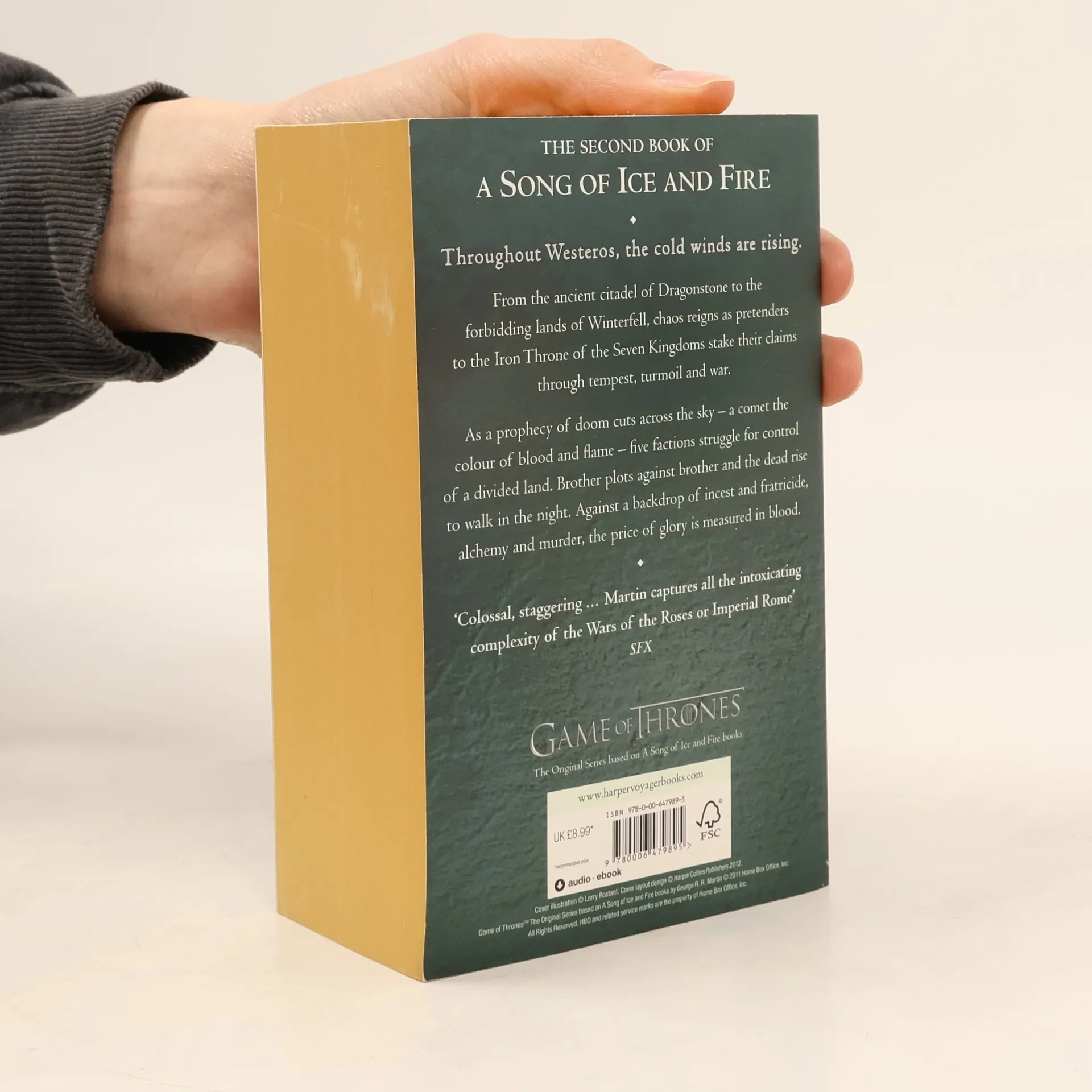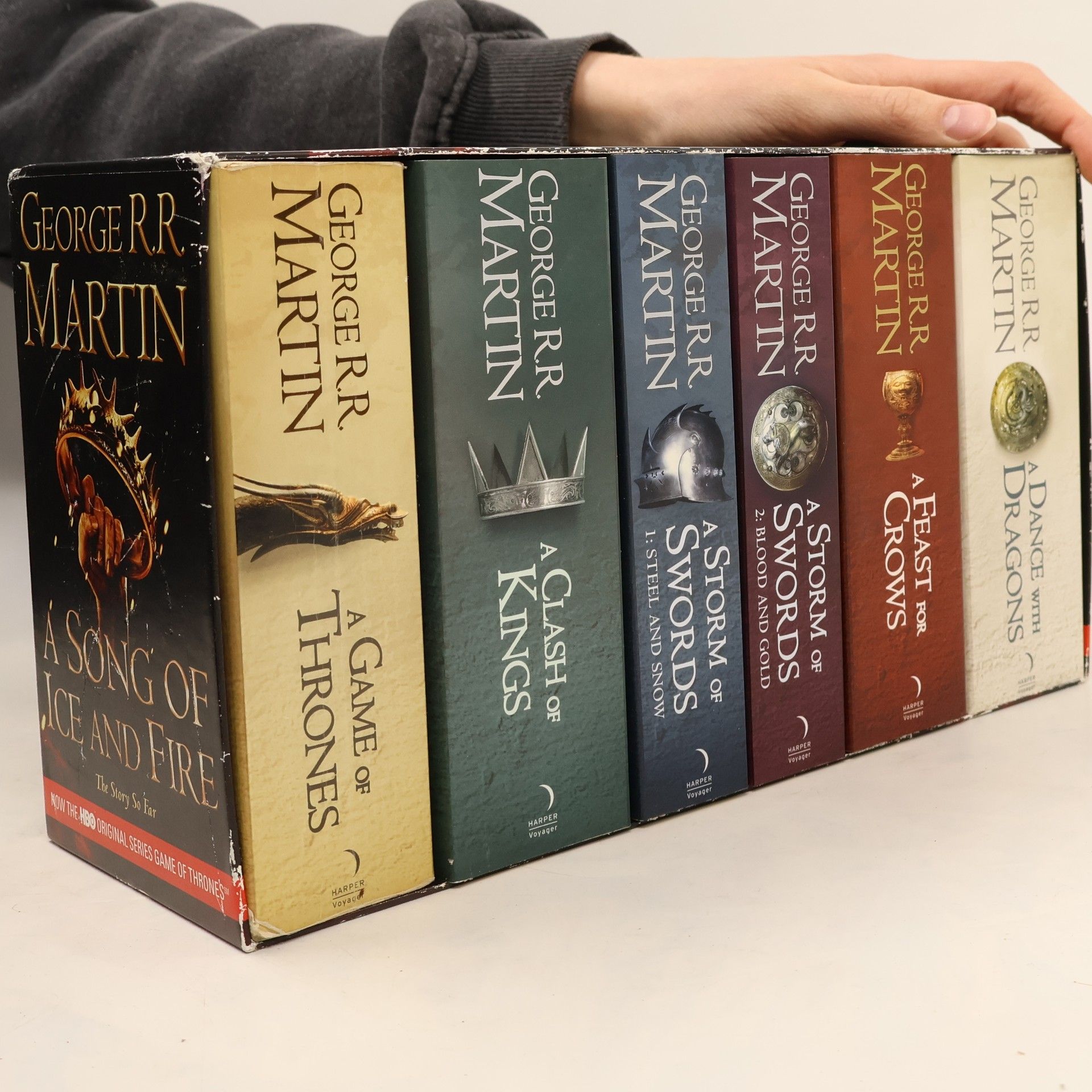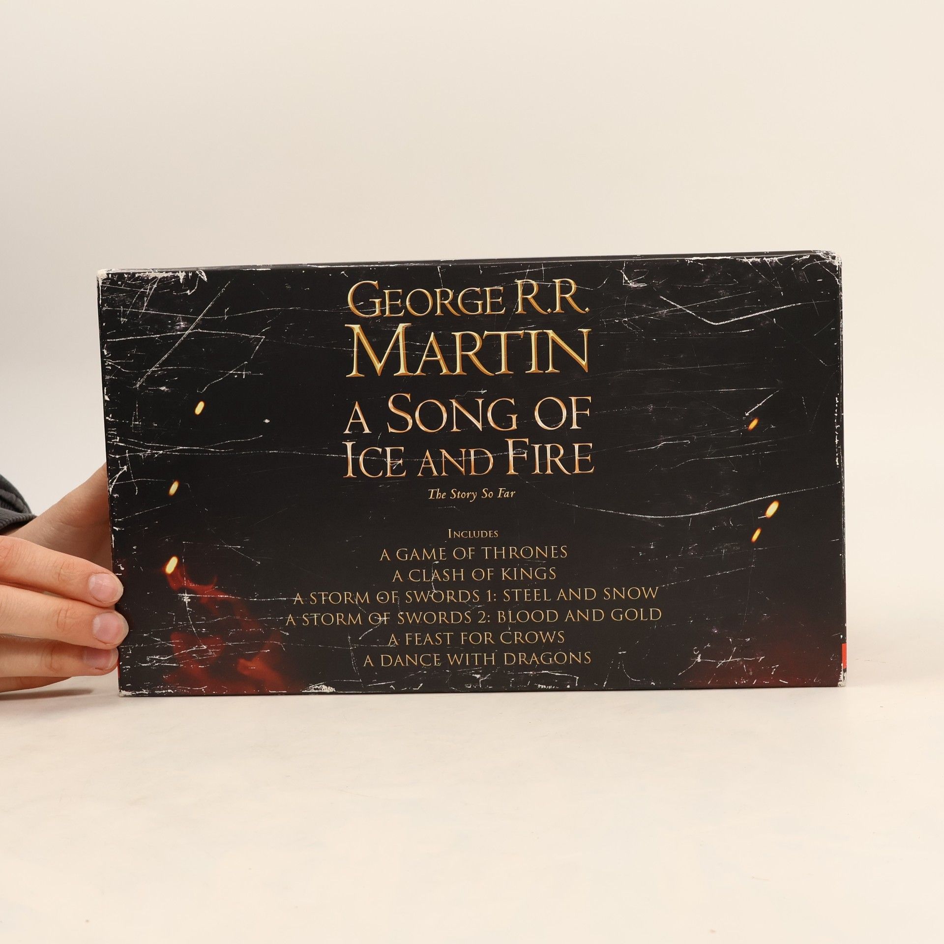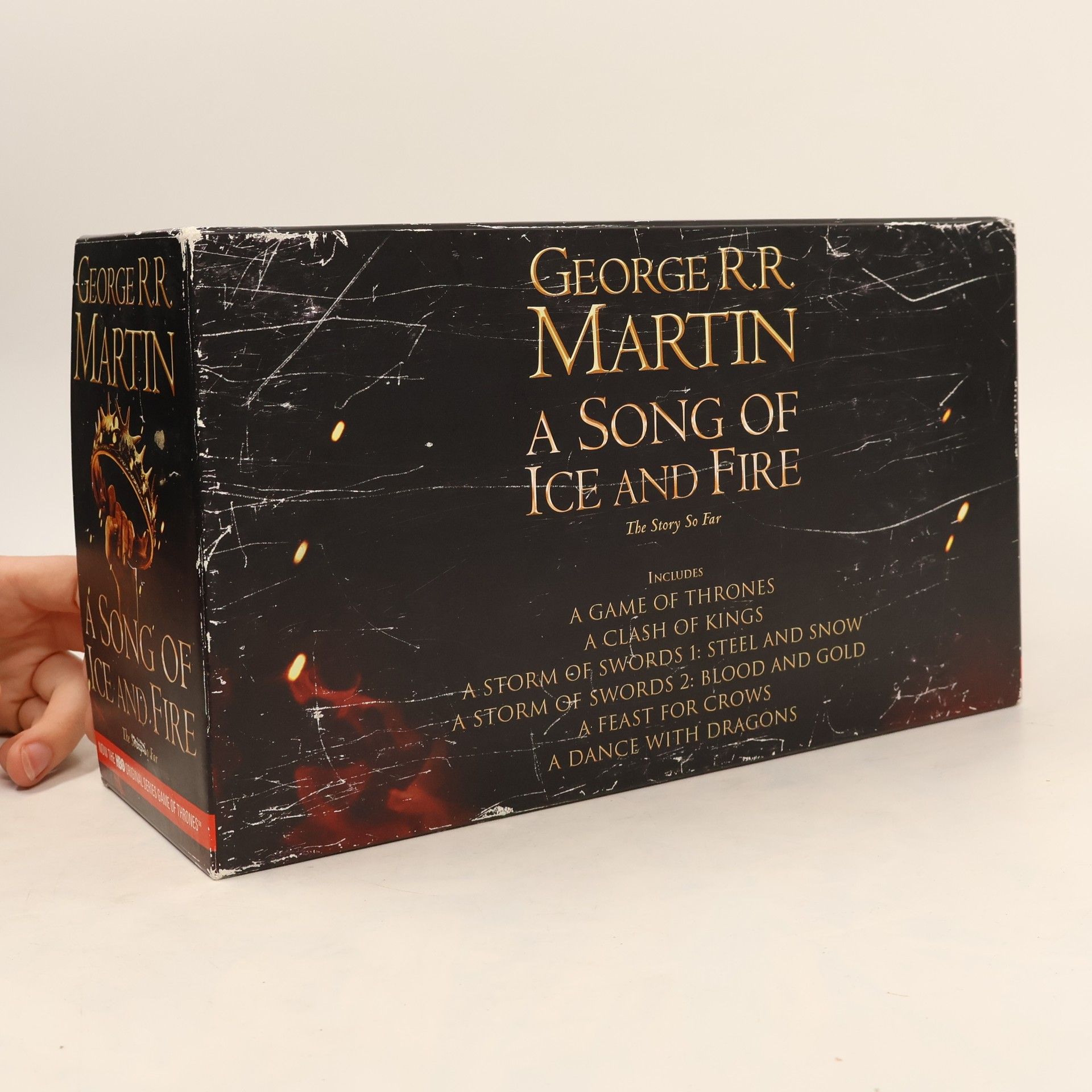 The complete box set of George R R Martin's internationally bestselling series A SONG OF ICE AND FIRE, the greatest fantasy epic of the modern age. George R.R. Martin's A Song of Ice and Fire series has set the benchmark for contemporary epic fantasy. Labelled by Time magazine as one of the top 100 most influential people in the world, Martin has conjured a world as complex and vibrant as that of J.R.R. Tolkien's, populated by a huge cast of fascinating, complex characters, and boasting a history that stretches back twelve thousand years. The box set includes: A GAME OF THRONES A CLASH OF KINGS A STORM OF SWORDS, 1: STEEL AND SNOW A STORM OF SWORDS, 2: BLOOD AND GOLD A FEAST FOR CROWS A DANCE WITH DRAGONS The dimension of the box set is 178mm x111mm.