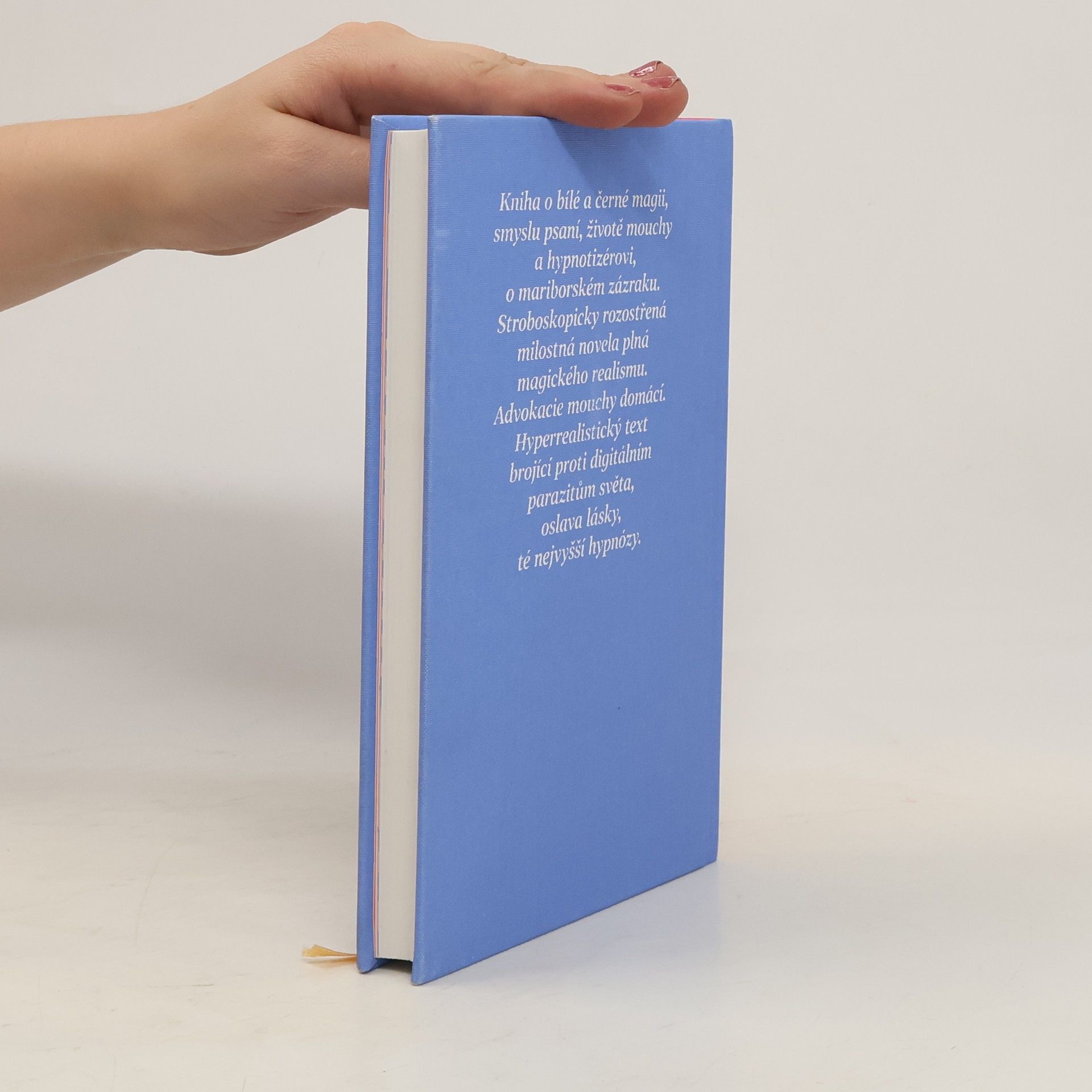 Kniha o bílé a černé magii, smyslu psaní, životě mouchy a hypnotizérovi, o mariborském zázraku. Stroboskopicky rozostřená milostná novela plná magického realismu. Advokacie mouchy domácí. Hyperrealisticky text brojící proti digitálním parazitům světa, oslava lásky, té nejvyšší hypnózy.