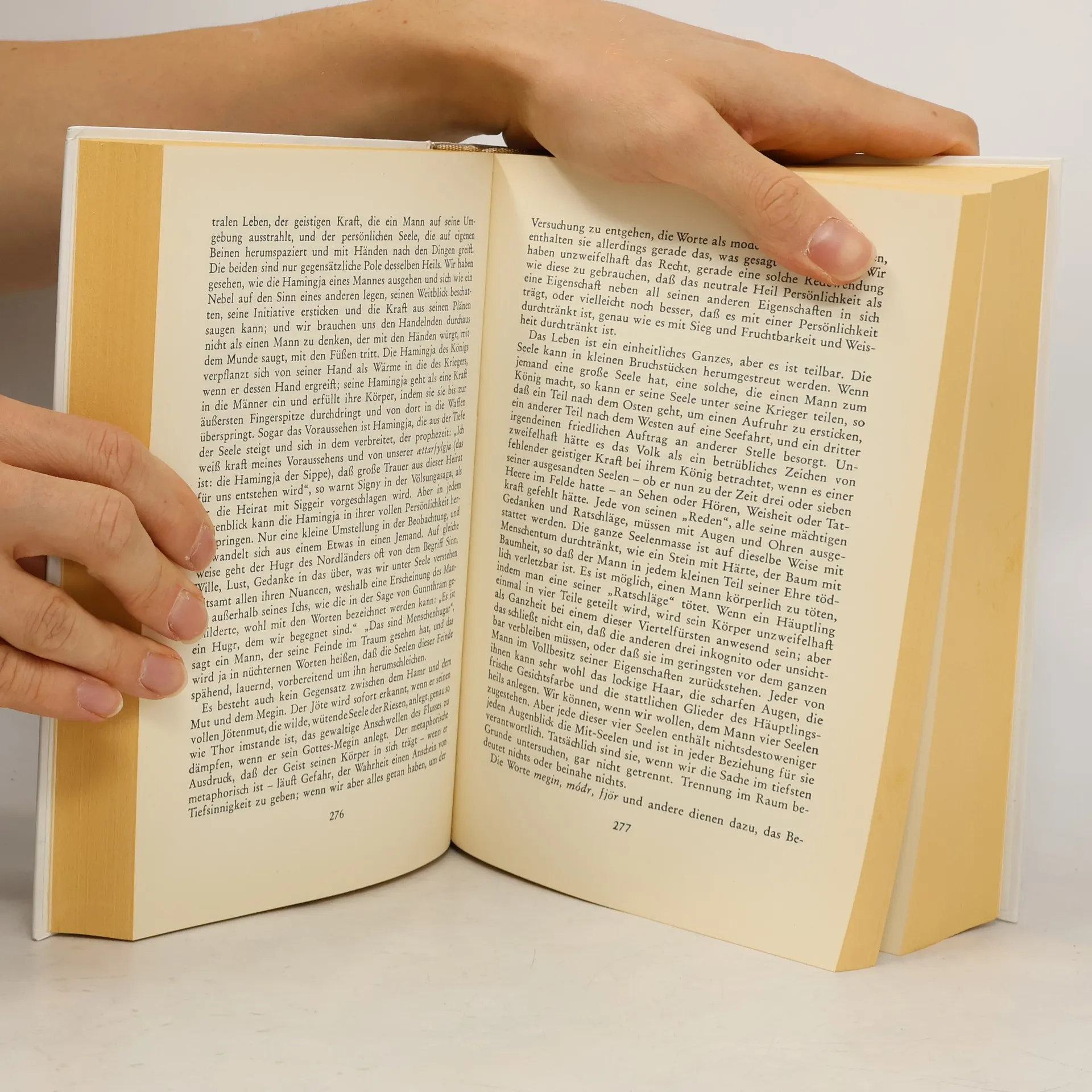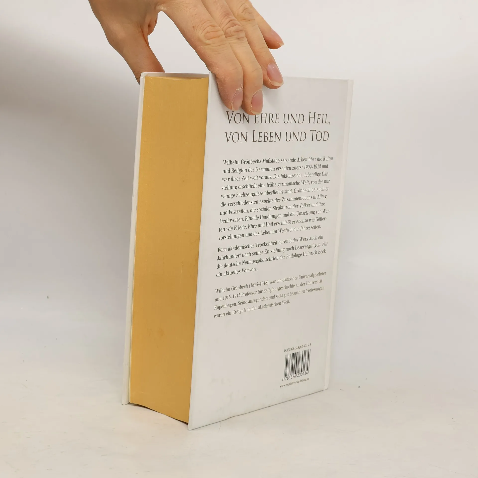 Wilhelm Grönbechs Maßstäbe setzende Arbeit über die Kultur und Religion der Germanen erschien zuerst 1909–1912 in vier Bänden im dänischen Original. Der erweiterten englischen Fassung von 1931 folgte 1937–1939 die erste deutsche Ausgabe. Grönbechs Werk war seiner Zeit weit voraus. Nach seiner Auffassung muss jede Kultur als ein Ganzes gesehen werden, das absolute, in sich selbst ruhende Werte besitzt. Grönbechs faktenreiche, lebendige Darstellung erschließt dem Leser eine frühe germanische Welt, von der nur wenige Sachzeugnisse überliefert sind. Sein enzyklopädisches Wissen und seine Auffassung, dass Wissenschaft eine sehr persönliche Angelegenheit sei und geradezu künstlerischer Fähigkeiten bedürfe, kommen dem Stil seiner Darstellung sehr entgegen. Fern akademischer Trockenheit bereitet das Werk auch ein Jahrhundert nach seiner Entstehung noch Lesevergnügen. Für die deutsche Neuausgabe in der Übersetzung von Ellen Hoffmeyer schrieb der Philologe Heinrich Beck (* 1929) ein Vorwort, das die Arbeit Grönbechs in den historischen Zusammenhang der Wissenschaftsentwicklung einordnet.