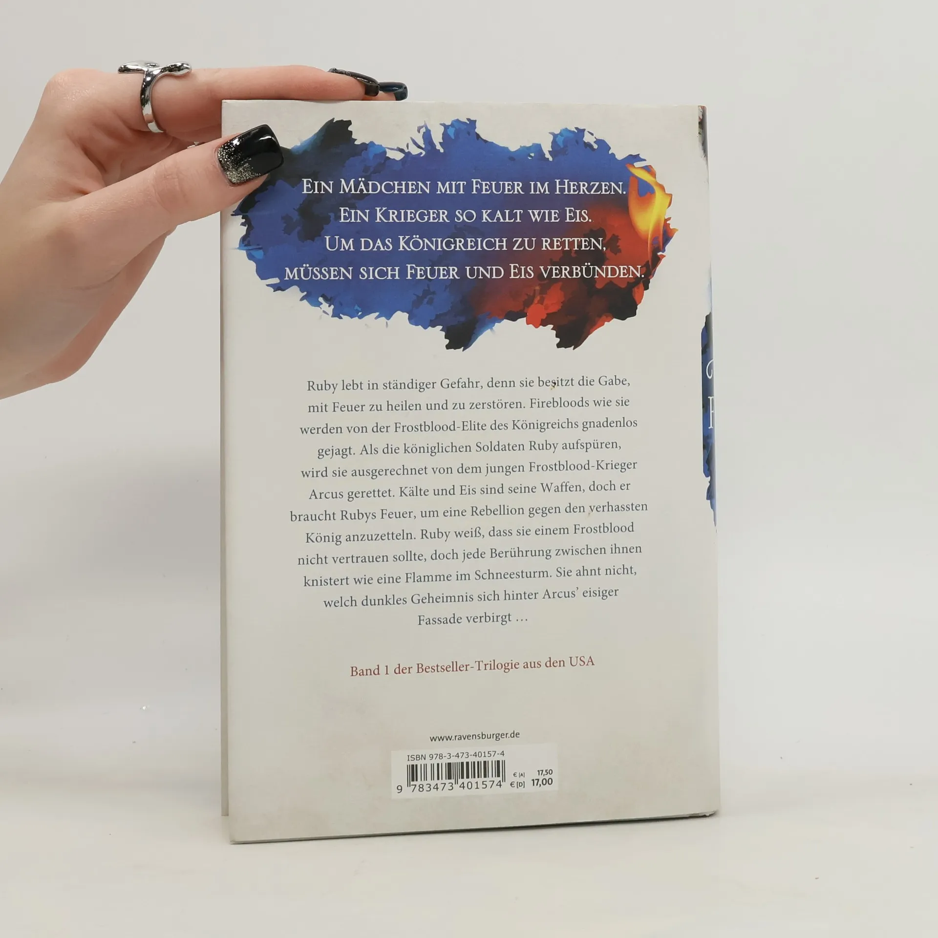 Ein Mädchen mit Feuer im Herzen.Ein Krieger so kalt wie Eis.Um das Königreich zu retten, müssen sich Feuer und Eis verbünden. Ruby lebt in ständiger Gefahr, denn sie besitzt die Gabe, mit Feuer zu heilen und zu zerstören. Firebloods wie sie werden von der Frostblood-Elite des Königreichs gnadenlos gejagt. Als die königlichen Soldaten Ruby aufspüren, wird sie ausgerechnet von dem jungen Frostblood-Krieger Arcus gerettet. Kälte und Eis sind seine Waffen, doch er braucht Rubys Feuer, um eine Rebellion gegen den verhassten König anzuzetteln. Ruby weiß, dass sie einem Frostblood nicht vertrauen sollte, doch jede Berührung zwischen ihnen knistert wie eine Flamme im Schneesturm. Sie ahnt nicht, welch dunkles Geheimnis sich hinter Arcus‘ eisiger Fassade verbirgt … Band 1 der Bestseller-Trilogie aus den USA