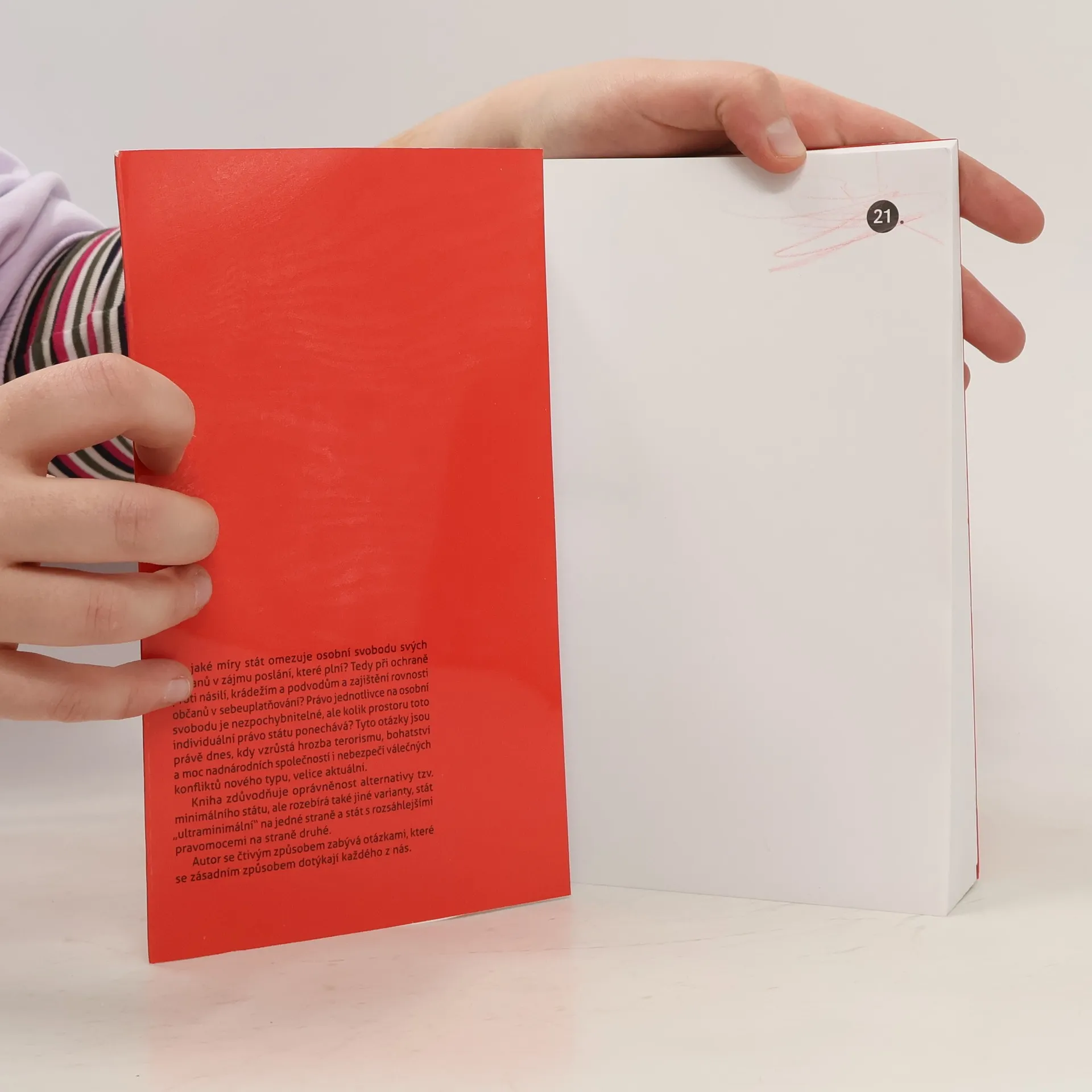 Do jaké míry stát omezuje osobní svobodu svých občanů v zájmu poslání, které plní? Tedy při ochraně proti násilí, krádežím a podvodům a zajištění rovnosti občanů v sebeuplatňování? Právo jednotlivce na osobní svobodu je nezpochybnitelné, ale kolik prostoru toto individuální právo státu ponechává? Tyto otázky jsou právě dnes, kdy stále sílí hrozba terorismu, bohatství a moc nadnárodních společností i nebezpečí válečných konfliktů nového typu, velice aktuální. Kniha zdůvodňuje oprávněnost alternativy tzv. minimálního státu, ale rozebírá také jiné varianty, stát „ultraminimální“ a stát s rozsáhlejšími pravomocemi. Autor se čtivým způsobem zabývá otázkami, které se zásadním způsobem dotýkají každého z nás. V roce 1974 kniha získala prestižní National Book Award.