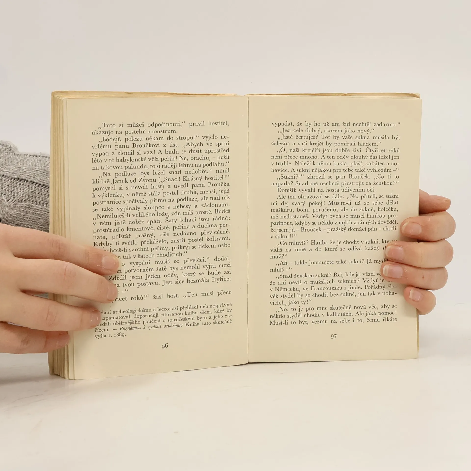 Ve druhé knize se autor s kritikou zaměřuje zejména na samotného Broučka. Ten se tajemnou podzemní chodbou ocitne náhle v patnáctém století, v husitské Praze připravující se na boj s křižáky. Ujme se jej pan Domšík, provádí ho po Praze a ubytuje Broučka ve své domácnosti. Autor důkladně využívá v pozdější době běžný prvek fantastických příběhů – konfrontaci obyčejného člověka s cizím prostředím, s jinou časovou rovinou. Při srovnání měla vyniknout Broučkova zbabělost a nedostatek morálky v protikladu s hrdinstvím husitů. Reálnost prožitého dobrodružství je v závěru opět zpochybněna Broučkovým procitnutím na dvorku hospody Vikárka. Výlety pana Broučka byly Leošem Janáčkem ztvárněny v podobě opery.