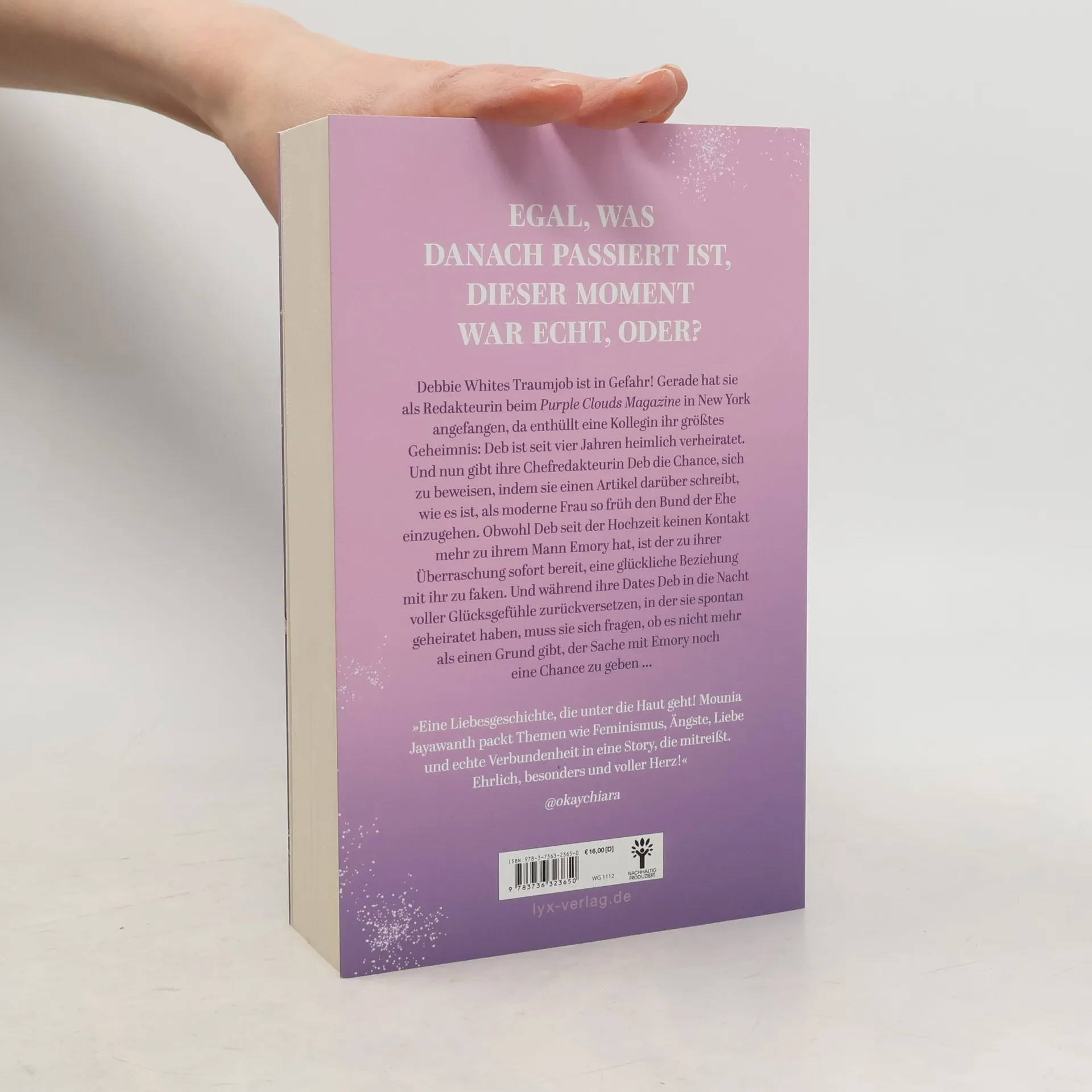 Große Gefühle in der Redaktion des PURPLE-CLOUDS-Magazins Debbie White hat eine Stelle in der Redaktion des angesagten Purple Clouds Magazin in New York ergattert. Aber schon in der ersten Woche wird ihr klar, dass sie sich dort beweisen muss, denn ihre Chefredakteurin hat von Debs größtem Geheimnis erfahren: Sie ist seit vier Jahren verheiratet. Und nun soll sie einen Artikel darüber schreiben, wie es ist, als moderne Frau so früh den Bund der Ehe einzugehen. Kein Problem - hätte Deb nicht seit der Hochzeit keinen Kontakt mehr zu ihrem Mann Emory. Doch wenn sie an die Nacht voller Glücksgefühle zurückdenkt, in der sie spontan geheiratet haben, fragt Deb sich, ob es nicht mehr als einen Grund gibt, der Sache mit Emory noch eine Chance zu geben ... Auftakt der neuen New-Adult-Trilogie von Mounia Jayawanth Dieses Buch gibt es in zwei Versionen: mit und ohne Motiv-Farbschnitt. Sobald die Farbschnitt-Ausgabe ausverkauft ist, liefern wir die Ausgabe ohne Farbschnitt aus.