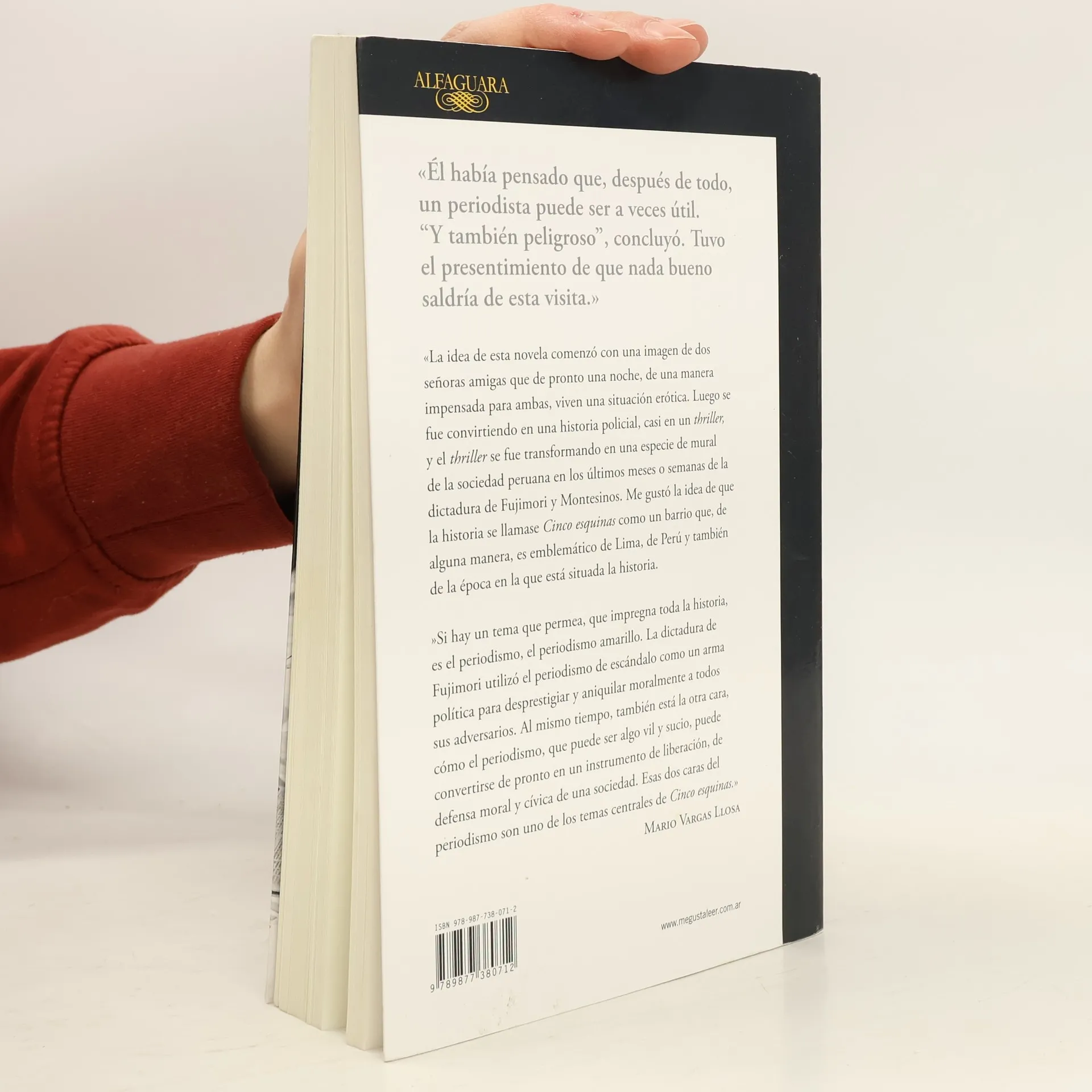 Cinco esquinas es la nueva y esperada novela del Premio Nobel de Literatura Mario Vargas Llosa. El habia pensado que, despues de todo, un periodista puede ser a veces util. 'Y tambien peligroso', concluyo. Tuvo el presentimiento de que nada bueno saldria de esta visita. La idea de esta novela comenzo con una imagen de dos senoras amigas que de pronto una noche, de una manera impensada para ambas, viven una situacion erotica. Luego se fue convirtiendo en una historia policial, casi un thriller, y el thriller se fue transformando en una especie de mural de la sociedad peruana en los ultimos meses o semanas de la dictadura de Fujimori y Montesinos. Me gusto la idea de que la historia se llamase Cinco esquinas como un barrio que, de alguna manera, es emblematico de Lima, de Peru y tambien de la epoca en la que esta situada la historia. Si hay un tema que permea, que impregna toda la historia, es el periodismo, el periodismo amarillo. La dictadura de Fujimori utilizo el periodismo amarillo, el periodismo de escandalo, como un arma politica para desprestigiar y aniquilar moralmente a todos sus adversarios. Al mismo tiempo, tambien esta la otra cara, como el periodismo, que puede ser algo vil y sucio, puede convertirse de pronto en un instrumento de liberacion, de defensa moral y civica de una sociedad. Esas dos caras del periodismo son uno de los temas centrales de Cinco esquinas.