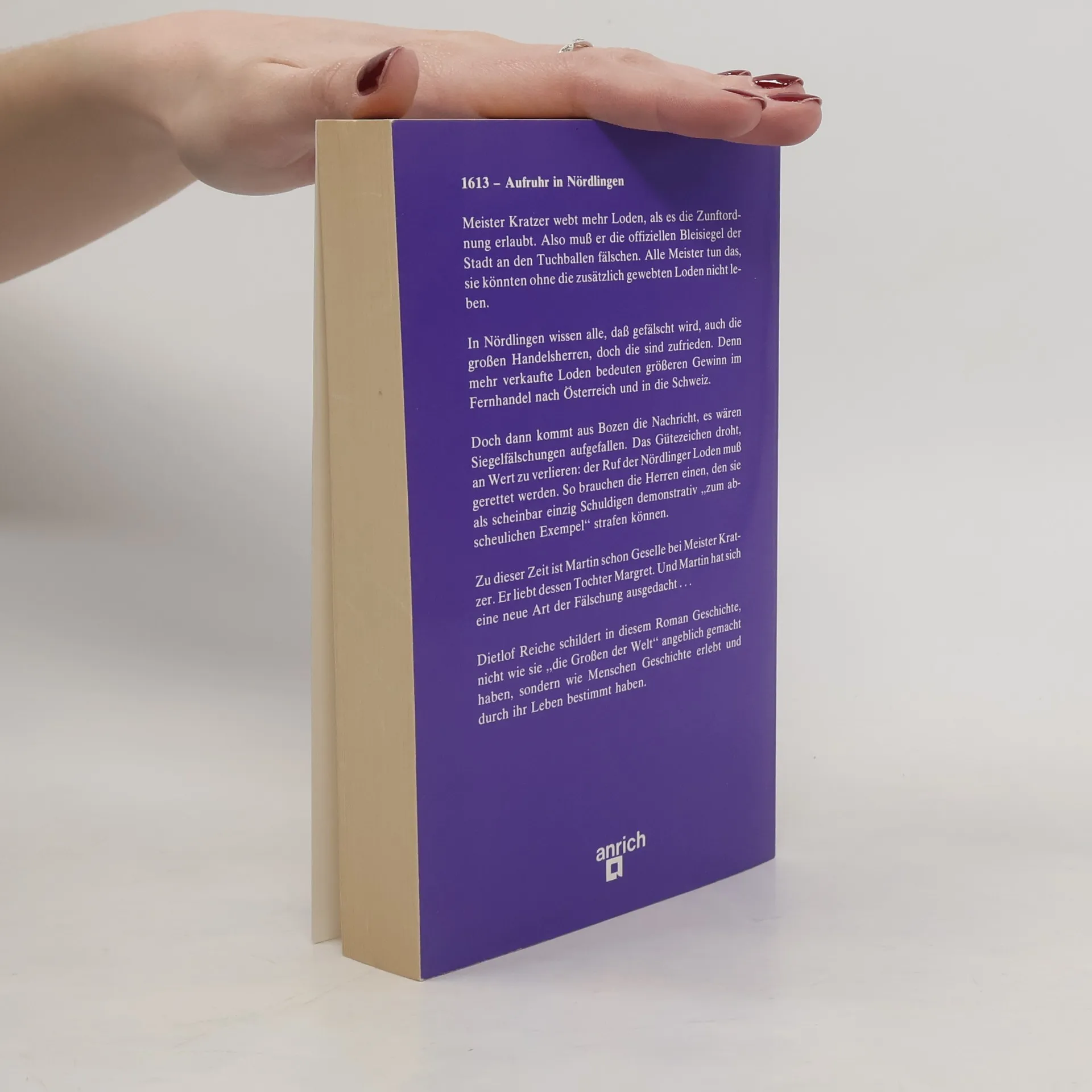 Im Jahr 1613 herrscht Aufregung in der freien Reichsstadt Nördlingen, als die Nachricht von gefälschten Siegeln aus Bozen eintrifft. Der gute Ruf der Nördlinger Loden steht auf dem Spiel. Die Lodenweber sind auf die zusätzlich gewebten Loden angewiesen, und die Handelsherren sind sich der Fälschungen bewusst, profitieren jedoch von den höheren Gewinnen, die der Verkauf dieser Ballen mit gefälschten Siegeln mit sich bringt. Um den Ruf zu retten, soll Meister Kratzer als Sündenbock bestraft werden. Der Geselle Martin, der in Kratzers Tochter verliebt ist, will seinem Meister helfen und hat eine neue Art der Fälschung entwickelt. Die Geschichte beleuchtet nicht die Herrschenden, sondern das Leben der einfachen Menschen und ihre Abhängigkeiten. Dietlof Reiche erweckt diese Thematik in seinem spannenden Roman zum Leben. Der Autor hat den komplexen Stoff sorgfältig recherchiert und meisterhaft die Schicksale weniger Figuren und eindringliche Situationen dargestellt. Der Roman wurde mit dem Oldenburger Jugendbuchpreis und dem Deutschen Jugendbuchpreis ausgezeichnet.
