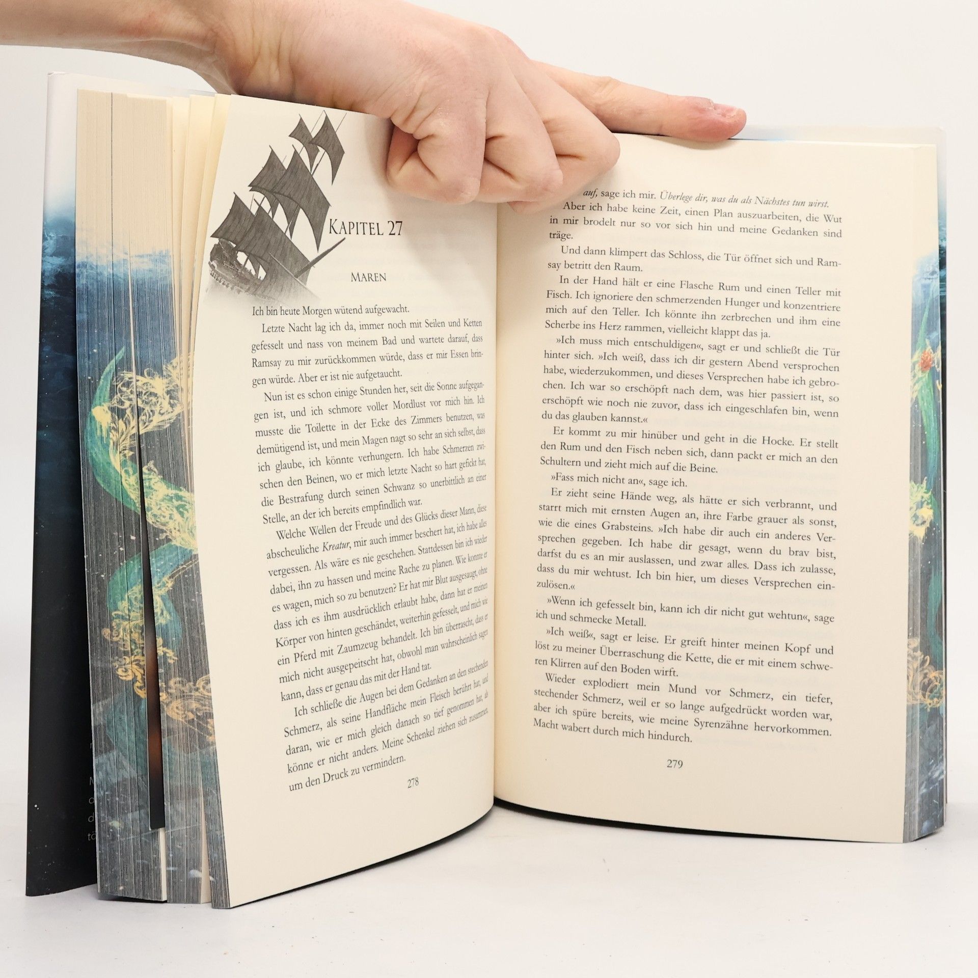 Mit farbigem Buchschnitt - Limitiert! - "Was, wenn es der kleinen Meerjungfrau bei ihrem Auserwählten nicht so gut geht, wie es in den Geschichten beschrieben wird?" Prinzessin Maren ist eine Frau mit einem Geheimnis. Mit sechzehn verkaufte sie ihre Seele an die Meerhexe Edonia und gab ein Leben unter Wasser im Austausch für die Liebe von Prinz Aerik an Land auf. Doch nach einem Jahrzehnt des Missbrauchs und des Elends durch den Prinzen, will Maren nichts anderes, als ihn und ihre königliche Rolle hinter sich zu lassen und Edonia zu finden, um den Zauber umzukehren. Doch bei einer Übersee-Reise werden sie und der Prinz von einer Bande berüchtigter Piraten unter der Führung des furchterregenden Kapitäns Ramsay »Bones« Battista als Geisel genommen. Maren kennt die üblen Geschichten über den berüchtigten Piraten– nicht nur, dass sein Schiff angeblich von den Verdammten heimgesucht wird, sondern auch, dass keine Gefangenen je überleben. Der Kapitän hat ebenfalls noch eine Rechnung mit der Meerhexe offen. Mit etwas Glück könnte Maren ihr altes Leben zurückbekommen, auch wenn der Kapitän es in seinen bösartigen Händen hält. Ramsay ahnt nicht, dass Marens Gier nach Rache und ihr Blutdurst seinem in nichts nachstehen. Maren verfällt der dunklen Natur des Piraten derweil immer mehr, während sie herausfindet, dass Ramsay ein Geheimnis hat, das tödlicher ist als ihr eigenes.