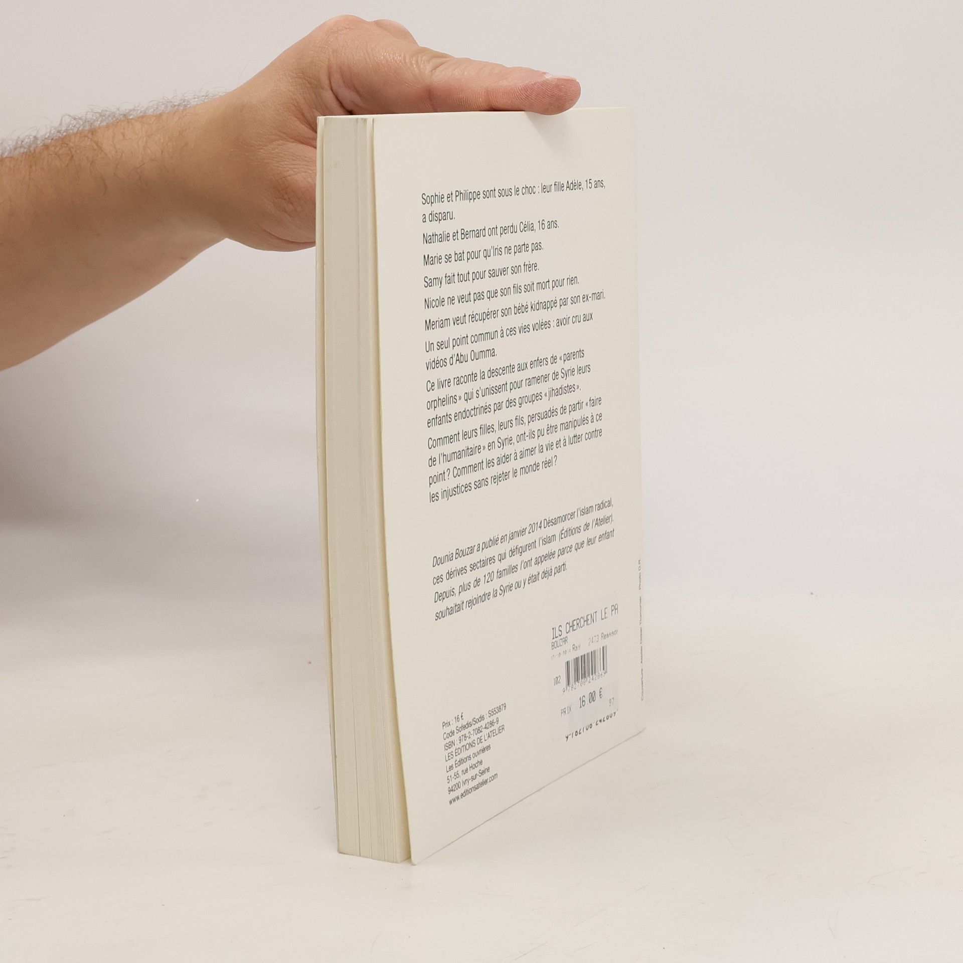 "Sophie et Philippe sont sous le choc : leur fille Adèle, 15 ans, a disparu. Nathalie et Bernard ont perdu Célia, 16 ans. Marie se bat pour qu'Iris ne parte pas. Samy fait tout pour sauver son frère. Nicole ne veut pas que son fils soit mort pour rien. Meriam veut récupérer son bébé kidnappé par son ex-mari. Un seul point commun à ces vies volées : avoir cru aux vidéos d'Abu Oumma. Ce livre raconte la descente aux enfers de «parents orphelins» qui s'unissent pour ramener de Syrie leurs enfants endoctrinés par des groupes «jihadistes». Comment leurs filles, leurs fils, persuadés de partir «faire de l'humanitaire» en Syrie, ont-ils pu être manipulés à ce point ? Comment les aider à aimer la vie et à lutter contre les injustices sans rejeter le monde réel ?" (4e de couv.)