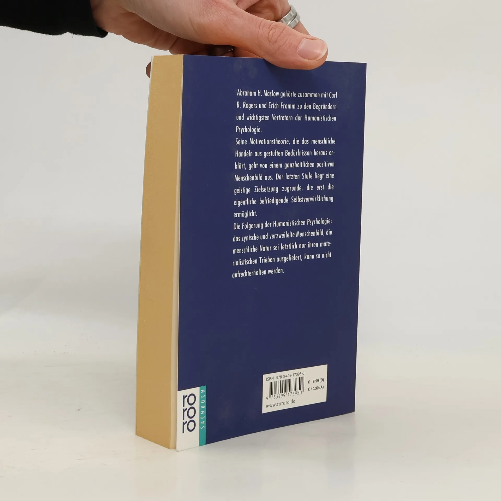 Abraham H. Maslow gehörte zusammen mit Carl R. Rogers und Erich Fromm zu den Begründern und wichtigsten Vertretern der Humanistischen Psychologie. Seine Motivationstheorie, die das menschliche Handeln aus gestuften Bedürfnissen heraus erklärt, geht von einem ganzheitlichen positiven Menschenbild aus. Der letzten Stufe liegt eine geistige Zielsetzung zugrunde, die erst die eigentliche befriedigende Selbstverwirklichung ermöglicht. Die Folgerung der Humanistischen Psychologie: das zynische und verzweifelte Menschenbild, die menschliche Natur sei letztlich nur ihren materialistischen Trieben ausgeliefert, kann so nicht aufrechterhalten werden.
