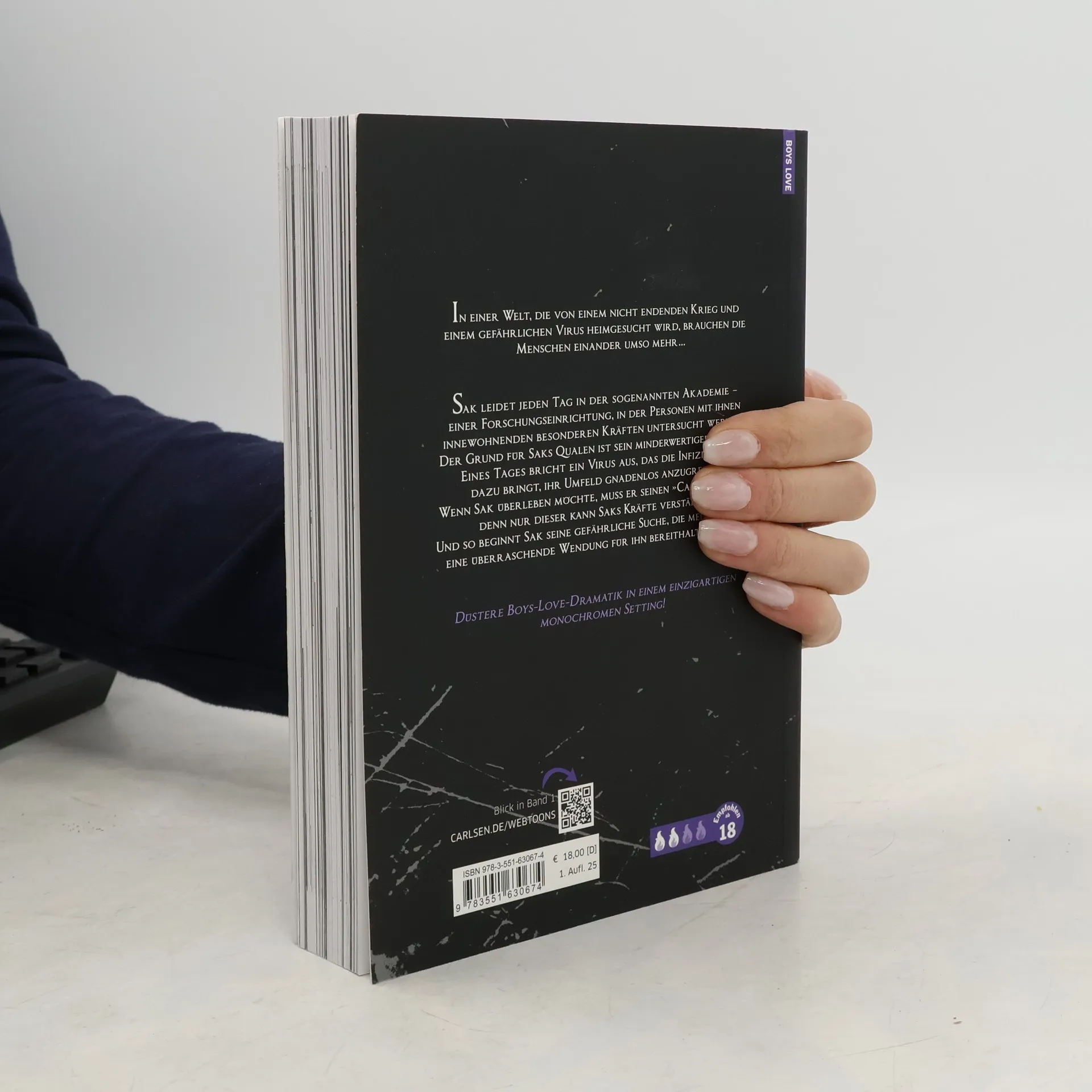 Düstere Boys-Love-Dramatik in einzigartigem monochromen Setting – mit Extra in 1. Auflage (solange der Vorrat reicht)! In einer Welt, die von einem nicht endenden Krieg und einem gefährlichen Virus heimgesucht wird, brauchen die Menschen einander umso mehr… Sak leidet jeden Tag in der sogenannten Akademie – einer Forschungseinrichtung, in der Personen mit ihnen innewohnenden besonderen Kräften untersucht werden. Der Grund für Saks Qualen ist sein minderwertiger »Core«. Eines Tages bricht ein Virus aus, das die Infizierten dazu bringt, ihr Umfeld gnadenlos anzugreifen. Wenn Sak überleben möchte, muss er seinen »Caller« finden, denn nur dieser kann Saks Kräfte verstärken. Und so beginnt Sak seine gefährliche Suche, die mehr als nur eine überraschende Wendung für ihn bereithalten wird... Mit farbigen Elementen im Buch Spice-Level: 2 von 4 Flammen. In diesem Boys-Love-Titel stehen die Gefühle im Mittelpunkt. Mit einzelnen expliziten Szenen. Abgeschlossen in 4 Bänden Dies ist Band 2 der Serie. Eine Dystopie voller Spannung und emotionaler Tiefe: Ein Boys-Love-Webtoon, der bis zur letzten Seite fesselt!