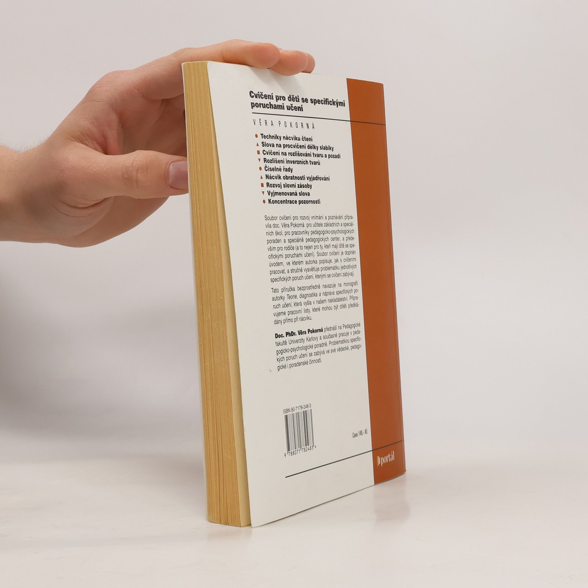 Soubor cvičení pro rozvoj vnímání a poznávání, který učitelům i rodičům umožňuje vybrat takovou činnost, která je pro dítě účelná, protože odpovídá jeho úrovni rozvoje jednotlivých funkcí a přispívá k nápravě příslušné specifické poruchy učení. V úvodu autorka popisuje, jak s cvičeními pracovat, a stručně vysvětluje problematiku jednotlivých specifických poruch učení, kterými se cvičení zabývají. Kniha navazuje na publikaci Teorie, diagnostika a náprava specifických poruch učení.