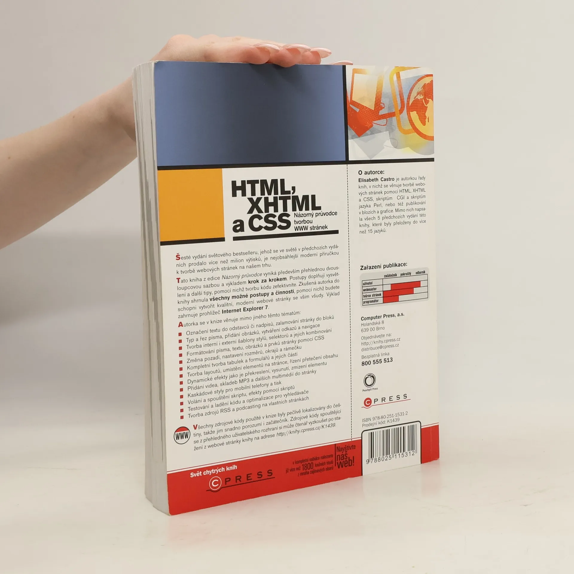 Šesté vydání světového bestselleru, jehož se ve světě v předchozích vydáních prodalo více než milion výtisků, je nejobsáhlejší moderní příručkou k tvorbě webových stránek na našem trhu. Tato kniha z edice Názorný průvodce vyniká především přehlednou dvousloupcovou sazbou a výkladem krok za krokem. Postupy doplňují vysvětlení a další tipy, pomocí nichž tvorbu kódu zefektivníte. Zkušená autorka do knihy shrnula všechny možné postupy a činnosti, pomocí nichž budete schopni vytvořit kvalitní, moderní webové stránky se vším všudy. Všechny zdrojové kódy použité v knize byly pečlivě lokalizovány do češtiny, takže jim snadno porozumí i začátečník.