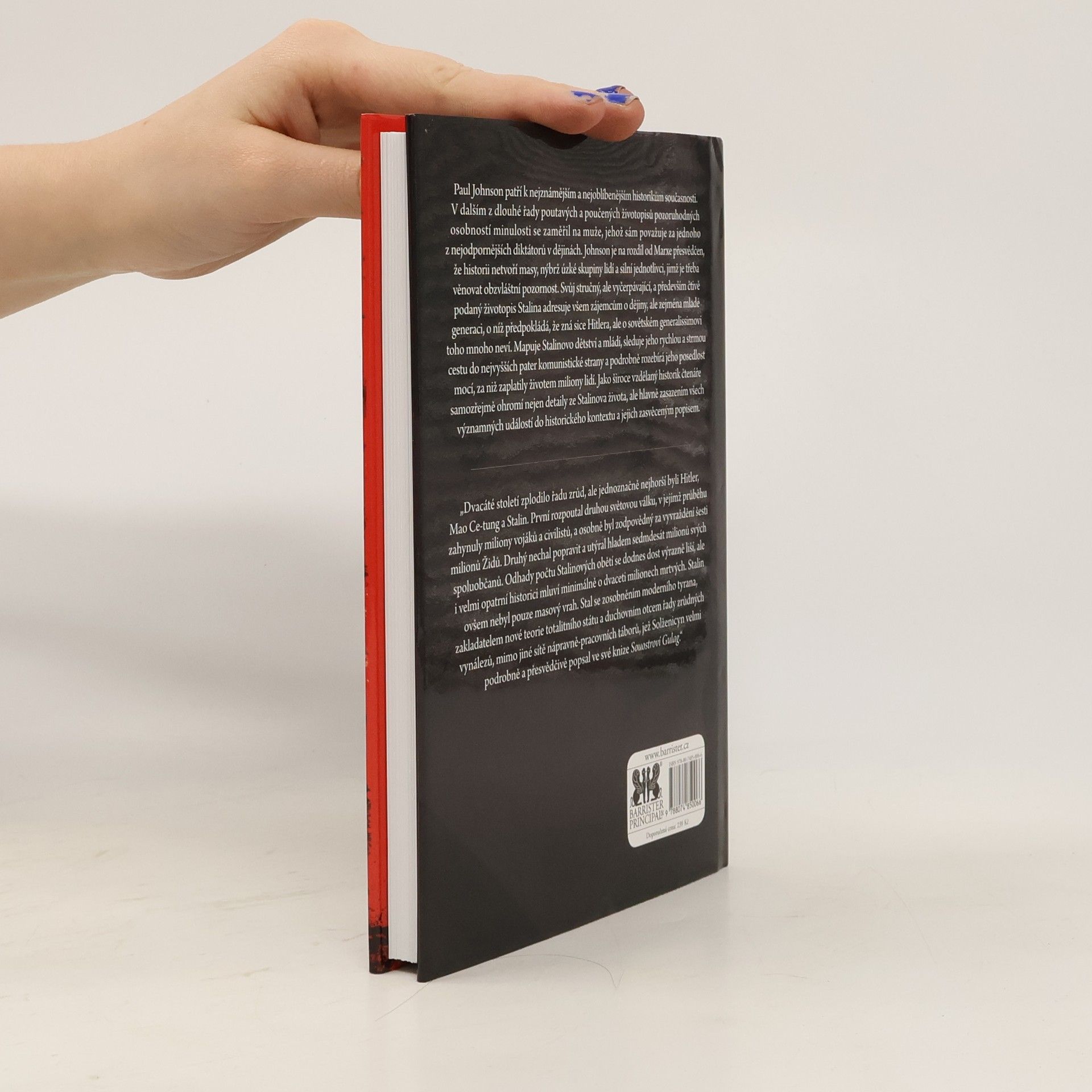Paul Johnson patří k nejznámějším a nejoblíbenějším historikům současnosti. Ve svém dalším z dlouhé řady poutavých a poučených životopisů pozoruhodných osobností minulosti se zaměřil na muže, jehož sám považuje za jednoho ze tří nejodpornějších diktátorů historie. Johnson je na rozdíl od Marxe přesvědčen, že historii netvoří masy, nýbrž úzké skupiny lidí a silní jednotlivci, jimž je třeba věnovat obzvláštní pozornost. Svůj stručný, ale vyčerpávající a především čtivě podaný životopis Stalina adresuje všem zájemcům o dějiny, ale zejména mladé generaci, jež zná Hitlera a Mao Ce-tunga, ale o sovětském generalissimovi toho mnoho neví. Přibližuje Stalinovo dětství a mládí, sleduje jeho rychlou cestu do nejvyšších pater komunistické strany a podrobně rozebírá jeho posedlost mocí, za niž zaplatily miliony lidí životem. O Stalinovi jsem psal s nechutí a práce na knize mne hodně bolela, přiznává Paul Johnson v úvodu své zatím poslední biografie. Bral jsem ji jako svou povinnost, ale nakonec mi kromě smutku v duši přinesla i jisté uspokojení. 1. vydání.