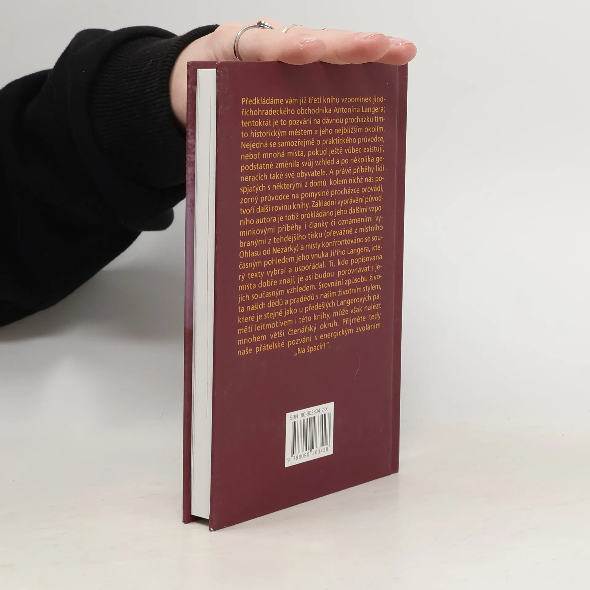 Dávná procházka okolo Jindřichova Hradce Třetí díl vzpomínek jindřichohradeckého obchodníka Antonína Langera. V této knize nás autor zve na dávnou procházku Jindřichovým Hradcem a jeho nejbližším okolím. Nejedná se samozřejmě o praktického průvodce, protože mnohá místa, pokud ještě vůbec existují, podstatně změnila svůj vzhled a po několika generacích také své obyvatele. A právě příběhy lidí spjatých s některými z domů, kolem nichž nás průvodce na pomyslné procházce provádí, tvoří další rovinu knihy. Základní vyprávění původního autora je prokládáno jeho dalšími vzpomínkovými příběhy i články a oznámeními vybranými z tehdejšího tisku (převážně z místního Ohlasu od Nežárky) a místy konfrontováno se současným pohledem autorova vnuka Jiřího Langera, který text vybral a uspořádal.