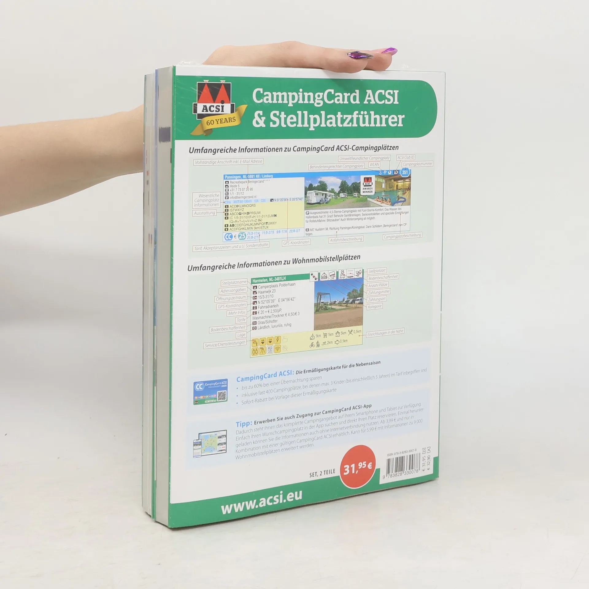 Mehr als 12 000 inspizierte Camping- und Stellplätze Nützliche Informationen zu Bodenbeschaffenheit, Preisen und Zahlungsmöglichkeiten Bis zu 60 % Ermässigung in der Nebensaison auf 3 000 Campingplätzen Mehr als 12 000 jährlich von ACSI inspizierte Campingplätze und von Facile Media ausgewählte Wohnmobilstellplätze in einem Handbuch. Übersichtlich nach Ländern sortiert und mit praktischen Informationen über Bodenbeschaffenheiten, Preise, Zahlungsmöglichkeiten und verfügbare Einrichtungen. Und mit GPS-Koordinaten für eine perfekte Navigation. So finden Sie immer einen schönen Platz in der Nähe! Zudem erhalten sie mit dem Campingführer die CampingCard ACSI-Ermässigungskarte. Damit zahlen Sie nie wieder zu viel für Ihre Campingaufenthalte in der Nebensaison. Auf 3000 Campingplätzen in Europa übernachten Sie während des Akzeptanzzeitraums der Ermässigungskarte zu einem festen Niedrigtarif von 15, 17, 19, 21, 23, 25 oder 27 € pro Nacht. So sparen Sie bis zu 60 % gegenüber dem normalen Übernachtungstarif!