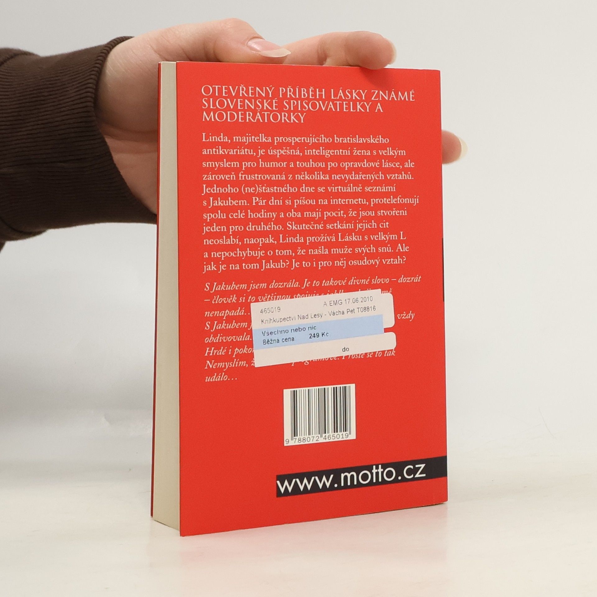 Nejprodávanější kniha na Slovensku roku 2007 v českém překladu. Velmi otevřená kniha o tom, co dokáže jeden obyčejný muž udělat s racionálně uvažující ženou. Linda, majitelka prosperujícího bratislavského antikvariátu, je úspěšná, inteligentní žena s velkým smyslem pro humor a touhou po opravdové lásce, ale zároveň frustrovaná z několika nevydařených vztahů. Jednoho (ne)šťastného dne se virtuálně seznámí s Jakubem. Pár dní si píšou na internetu, protelefonují spolu celé hodiny a oba mají pocit, že jsou stvořeni jeden pro druhého. Skutečné setkání jejich cit neoslabí, naopak, Linda prožívá Lásku s velkým L a nepochybuje o tom, že našla muže svých snů. Ale jak je na tom Jakub? Je to i pro něj osudový vztah?