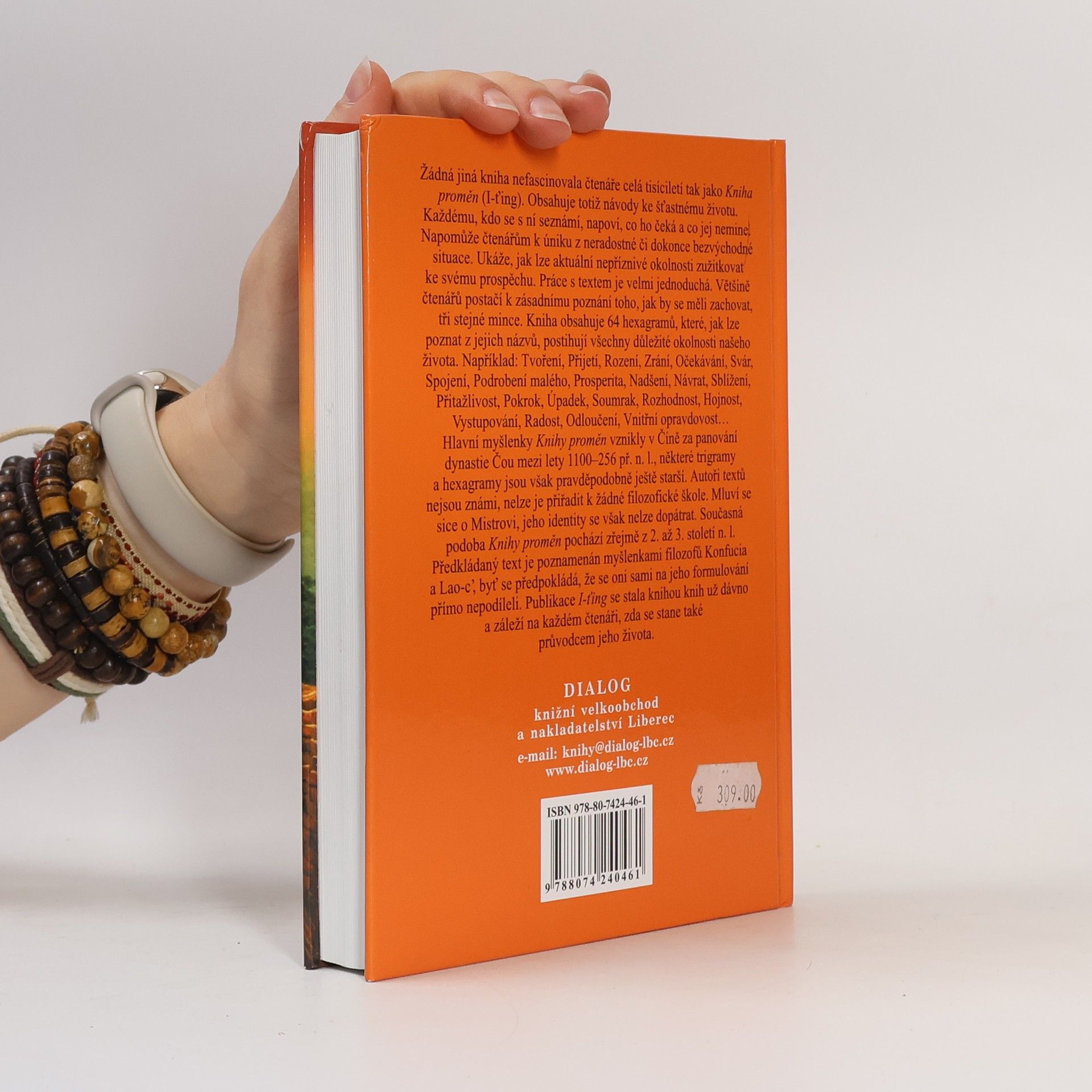 Kniha proměn – únik z nesnází, osobní rádce, předpověď budoucnosti Žádná jiná kniha nefascinuje čtenáře už celá tisíciletí tak, jako Kniha proměn (I-ťing). Obsahuje návody ke šťastnému životu pro každého čtenáře. Napoví mu, co ho čeká a co jej nemine. Napomůže k úniku z nepříznivé či dokonce z bezvýchodné situace. Ukáže, jak lze aktuální zlé proměnit v prospěch. Práce s knihou je velmi jednoduchá. Většině čtenářů postačí k vrcholnému poznání tři stejné mince. Kniha obsahuje 64 hexagramů, jež postihují všechny důležité okolnosti našeho života. Například: Tvořivost, Vstřícnost, Těžké začátky, Brána mládí, Čekání, Nedorozumění, Setkání, Podřízení, Moudrost, Nadšení, Návrat, Přimknutí, Vzestup, Protiklad, Překážky, Osvobození, Klid, Ztroskotání, Podřízení, Poutník, Konflikt, Řešení… Hlavní myšlenky Knihy proměn vznikly v Číně za panování dynastie Čou mezi 1100 – 256 lety př. n. l. Trigramy a hexagramy jsou pravděpodobně ještě starší. Autoři Knihy proměn nejsou známi, nelze je přiřadit k žádné filozofické škole. Mluví se sice o Mistrovi, k jeho identitě se však nelze dopátrat. Současné podoba Knihy proměn pochází zřejmě z 2 až 3 století n. l. Předkládaný text je poznamenán filozofií Konfucia a Lao-c´e, byť se předpokládá, že se Konfucius na textu nepodílel. Kniha proměn se stala knihou knih už dávno, záleží jen na čtenáři, zda se stane také knihou jeho života.