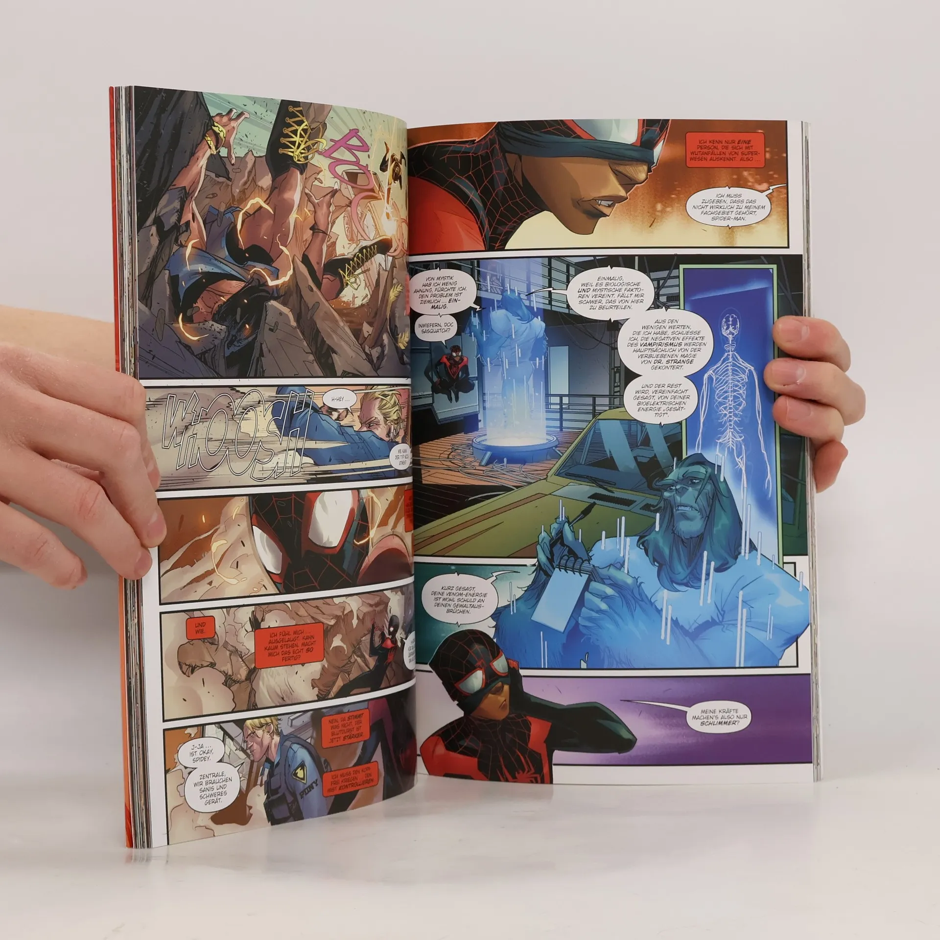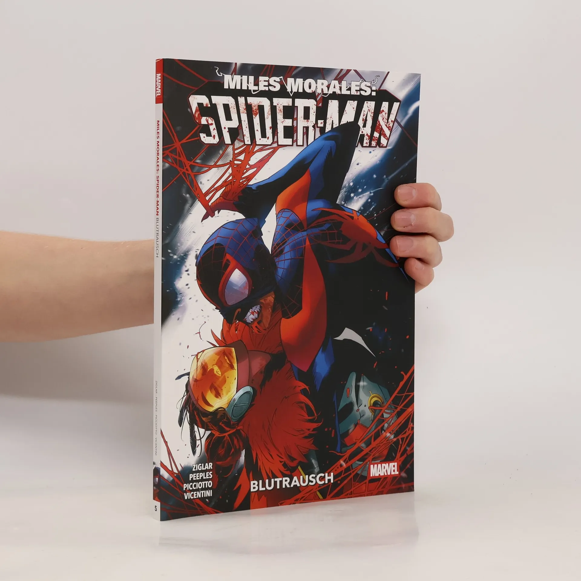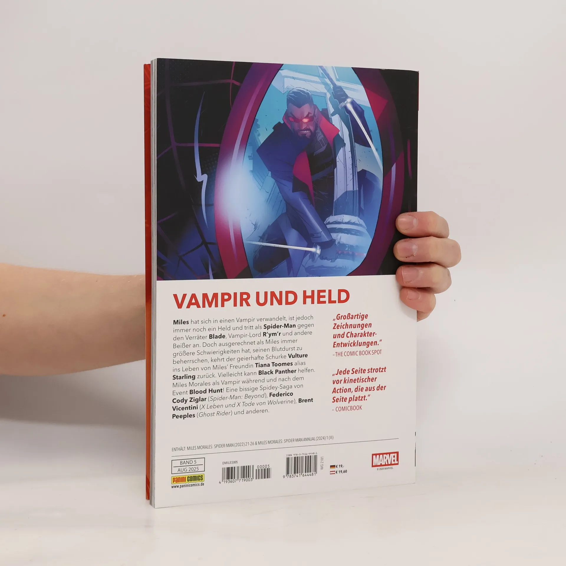 VAMPIR UND HELD Miles hat sich in einen Vampir verwandelt, ist jedoch immer noch ein Held und tritt als Spider-Man gegen den Verräter Blade, Vampir-Lord R’ym’r und andere Beißer an. Doch ausgerechnet als Miles immer größere Schwierigkeiten hat, seinen Blutdurst zu beherrschen, kehrt der geierhafte Schurke Vulture ins Leben von Miles‘ Freundin Tiana Toomes alias Starling zurück. Vielleicht kann Black Panther helfen. Miles Morales als Vampir während und nach dem Event Blood Hunt! Eine bissige Spidey-Saga von Cody Ziglar (Spider-Man: Beyond), Federico Vicentini (X Leben und X Tode von Wolverine), Brent Peeples (Ghost Rider) und anderen. ENTHÄLT: MILES MORALES: SPIDER-MAN (2022) 21-26 & MILES MORALES: SPIDER-MAN ANNUAL (2024) 1 (III)