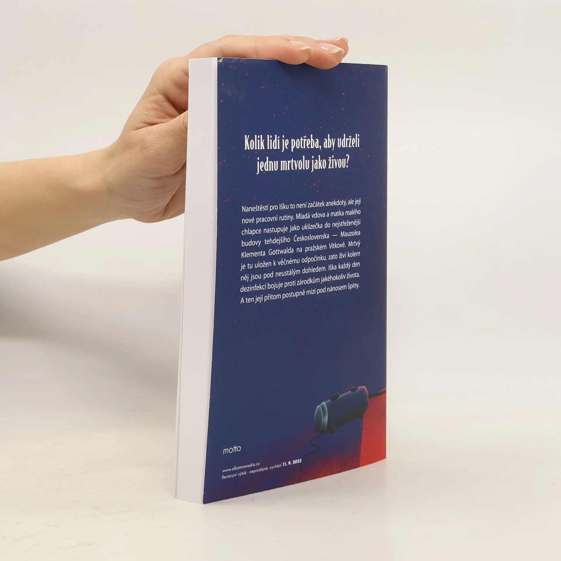 Nový román Lucie Hlavinkové se vrací do padesátých let. Kolik lidí je potřeba, aby udrželi jednu mrtvolu jako živou? Naneštěstí pro Išku to není začátek anekdoty, ale její nové pracovní rutiny. Mladá vdova a matka malého chlapce nastupuje jako uklízečka do nejstřeženější budovy tehdejšího Československa — Mauzolea Klementa Gottwalda na pražském Vítkově. Mrtvý je tu uložen k věčnému odpočinku, zato živí kolem něj jsou pod neustálým dohledem. Iška každý den dezinfekcí bojuje proti zárodkům jakéhokoliv života. A ten její přitom postupně mizí pod nánosem špíny.