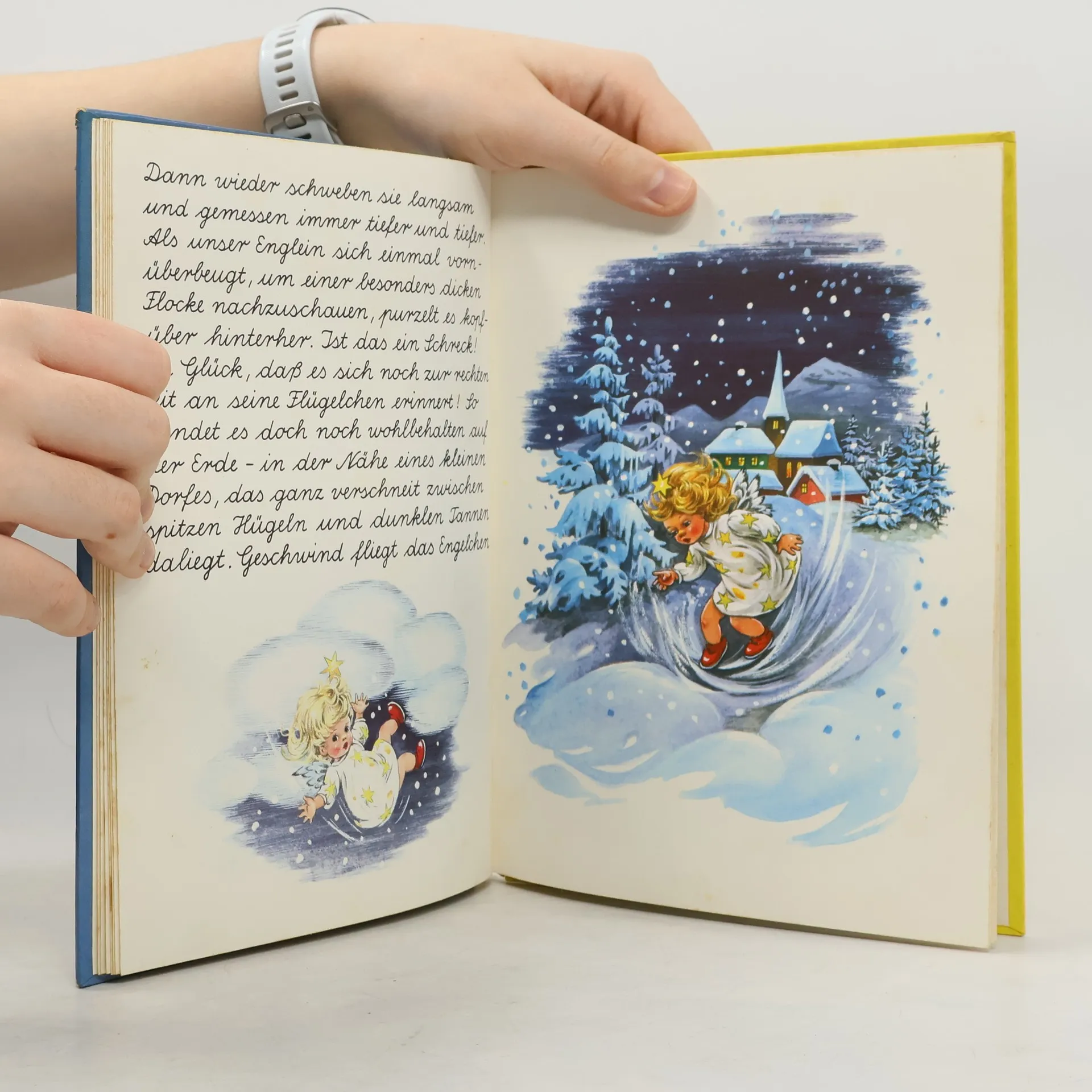 Die Geschichte "Das Englein mit dem goldenen Näschen" erzählt von einem kleinen Engel, der bei den Weihnachtsvorbereitungen im Himmel noch nicht so recht mithelfen kann, schlussendlich kopfüber von einer Wolke purzelt und auf der Erde landet .