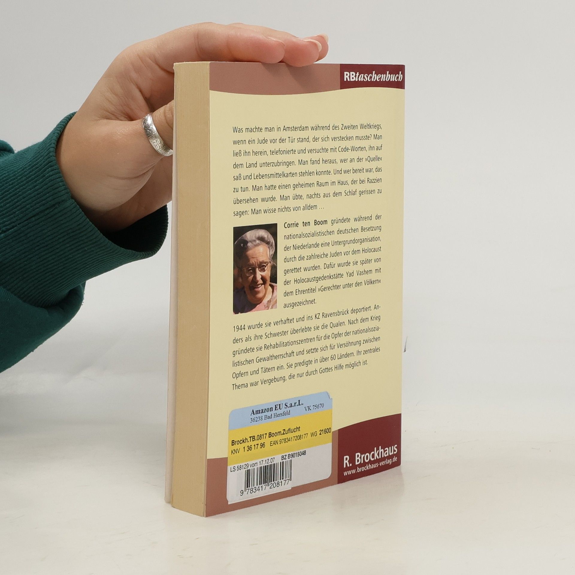 Corrie ten Boom, die niederländische Autorin wurde vor allem mit ihrem Buch 'Die Zuflucht' berühmt, in dem sie erzählt, wie ihre Familie während des Dritten Reichs Juden in ihrem Haus versteckte und dabei schwere Opfer bringen mußte. In ihren Werken spiegeln sich die ungewöhnliche Tiefe und Kraft ihres Glaubens und ihre warmherzige Art auf bewegende Weise wider. Der internationale Bestseller berichtet über die entscheidenden Jahre im Leben Corrie ten Booms. Mit ihrer ganze Familie bietet sie Verfolgten Schutz und wird selbst zu einer Verfolgten: 1944 wird sie verhaftet und ins KZ Ravensbrück deportiert. Anders als ihre Schwester überlebt sie die Qualen. Trotz alldem wird sie eine Botschafterin des Themas "Vergebung" und predigt nach dem Krieg in über 60 Ländern.
