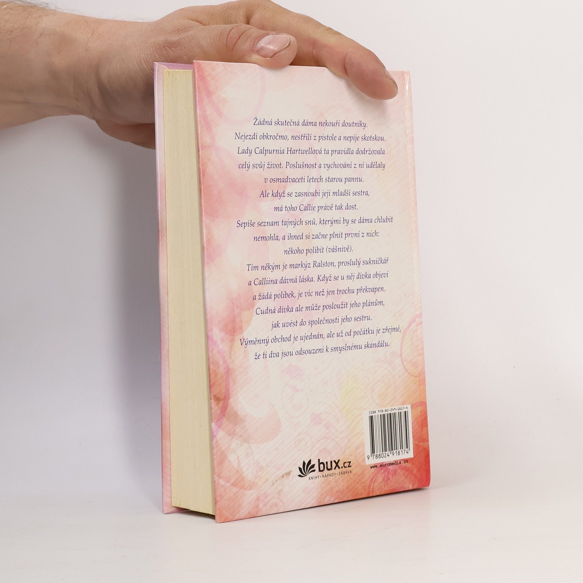 První kniha ze série historických romancí nové autorky. Žádná skutečná dáma nekouří doutníky, nejezdí obkročmo, nestřílí z pistole a nepije skotskou. Lady Calpurnia Hartwellová ta pravidla dodržovala celý svůj život. Poslušnost a vychování z ní udělaly v osmadvaceti letech starou pannu. Ale když se zasnoubí její mladší sestra, má toho Callie právě tak dost. Sepíše seznam tajných snů, kterými by se dáma chlubit nemohla, a ihned si začne plnit první z nich: políbit markýze Ralstona.
