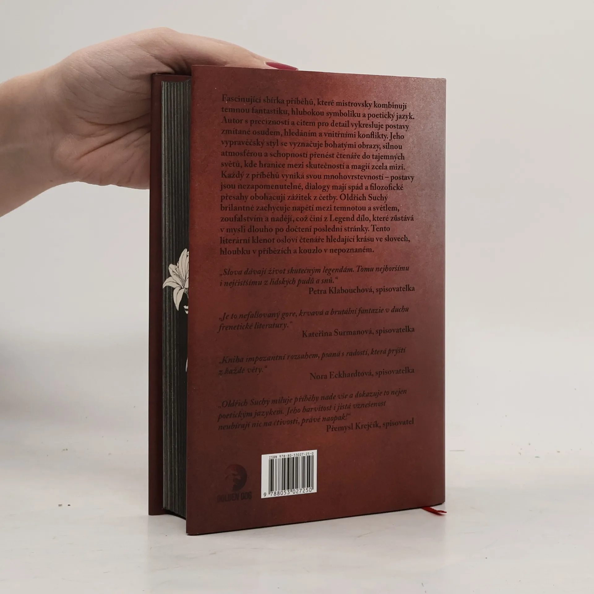 Fascinující sbírka příběhů, které mistrovsky kombinují temnou fantastiku, hlubokou symboliku a poetický jazyk. Autor s precizností a citem pro detail vykresluje postavy zmítané osudem, hledáním a vnitřními konflikty. Jeho vypravěčský styl se vyznačuje bohatými obrazy, silnou atmosférou a schopností přenést čtenáře do tajemných světů, kde hranice mezi skutečností a magií zcela mizí.Každý z příběhů vyniká svou mnohovrstevnatostí – postavy jsou nezapomenutelné, dialogy mají spád a filozofické přesahy obohacují zážitek z četby. Oldřich Suchý brilantně zachycuje napětí mezi temnotou a světlem, zoufalstvím a nadějí, což činí z Legend dílo, které zůstává v mysli dlouho po dočtení poslední stránky. Tento literární klenot osloví čtenáře hledající krásu ve slovech, hloubku v příbězích a kouzlo v nepoznaném.