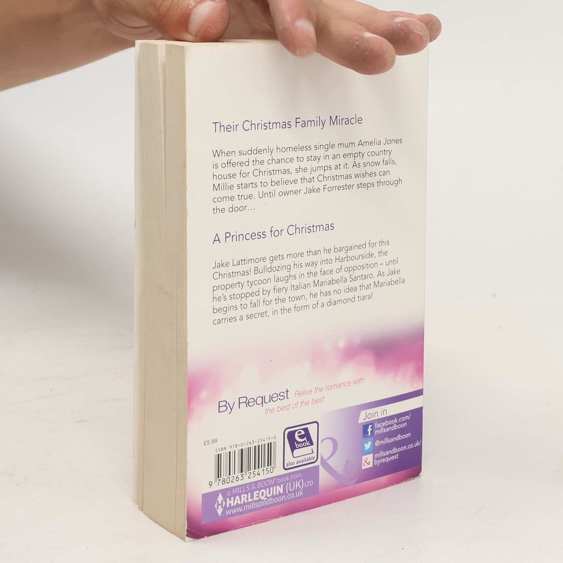Their Christmas Family MiracleWhen suddenly homeless single mum Amelia Jones is offered the chance to stay in an empty country house for Christmas, she jumps at it. As snow falls, Millie starts to believe that Christmas wishes can come true. Until owner Jake Forrester steps though the door...A Princess for ChristmasJake Lattimore gets more than he bargained for this Christmas! Bulldozing his way into Harbourside, the property tycoon laughs in the face of the opposition - until he's stopped by fiery Italian Marian Ella Santaro. As Jake begins to fall for the town, he has no idea that Maria Bella carries a secret, in the form of a diamond tiara!