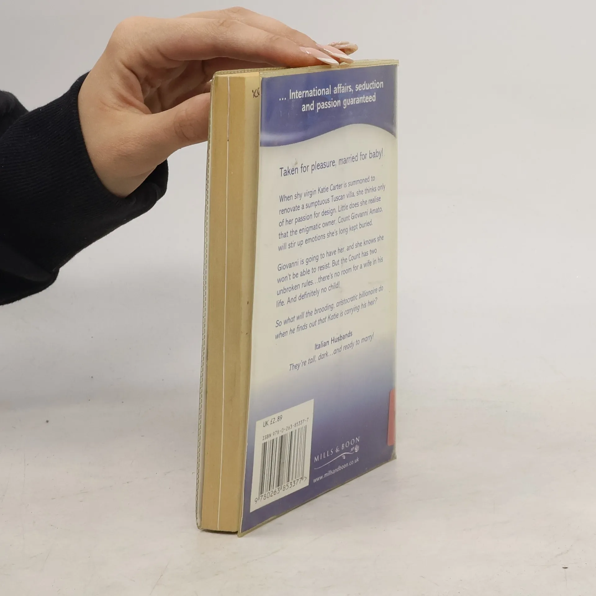 Taken for pleasure, married for baby When shy virgin Katie Carter is summoned to renovate a sumptuous Tuscan villa, she thinks only of her passion for design. Little does she realise that the enigmatic owner, Count Giovanni Amato, will stir up emotions she's long kept buried.Giovanni is going to have her, and she knows she won't be able to resist. But the Count has two unbroken rules... there's no room for a wife in his life. And definitely no child So what will the brooding, aristocratic billionaire do when he finds out that Katie is carrying his heir?Italian Husbands - They're tall, dark... and ready to marry