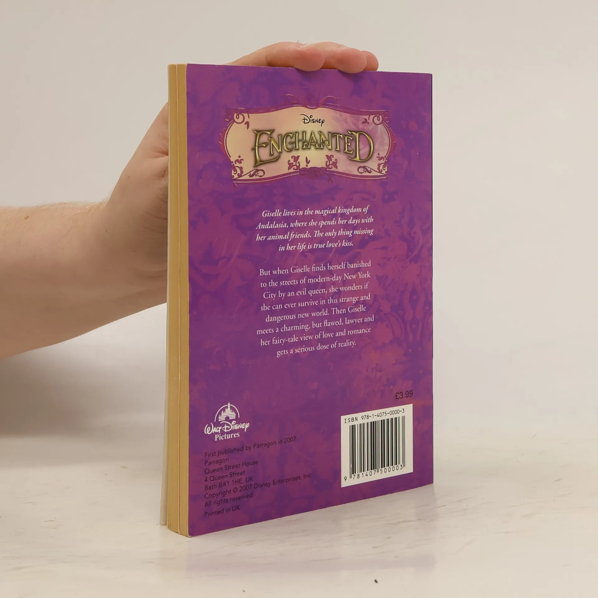 Giselle tror at eventyr kan bli virkelighet siden hun bor i den magiske verdenen Andalasia. Hun blir kastet i armene på den sjarmerende og vakre prinsen Edward, og Giselle er overbevist om at alt vil ende perfekt. Så faller Giselle ned i en brønn og dukker opp i de kaotiske gatene på Manhattan. I denne virkeligheten føler hun at drømmen "lykkelig alle sine dager" er alt annet enn realistisk, helt til hun møter en kynisk advokat og de sammen oppdager at den virkelige verden også kan være magisk. Midt i boka er det 8 sider med bilder fra filmen med samme navn.