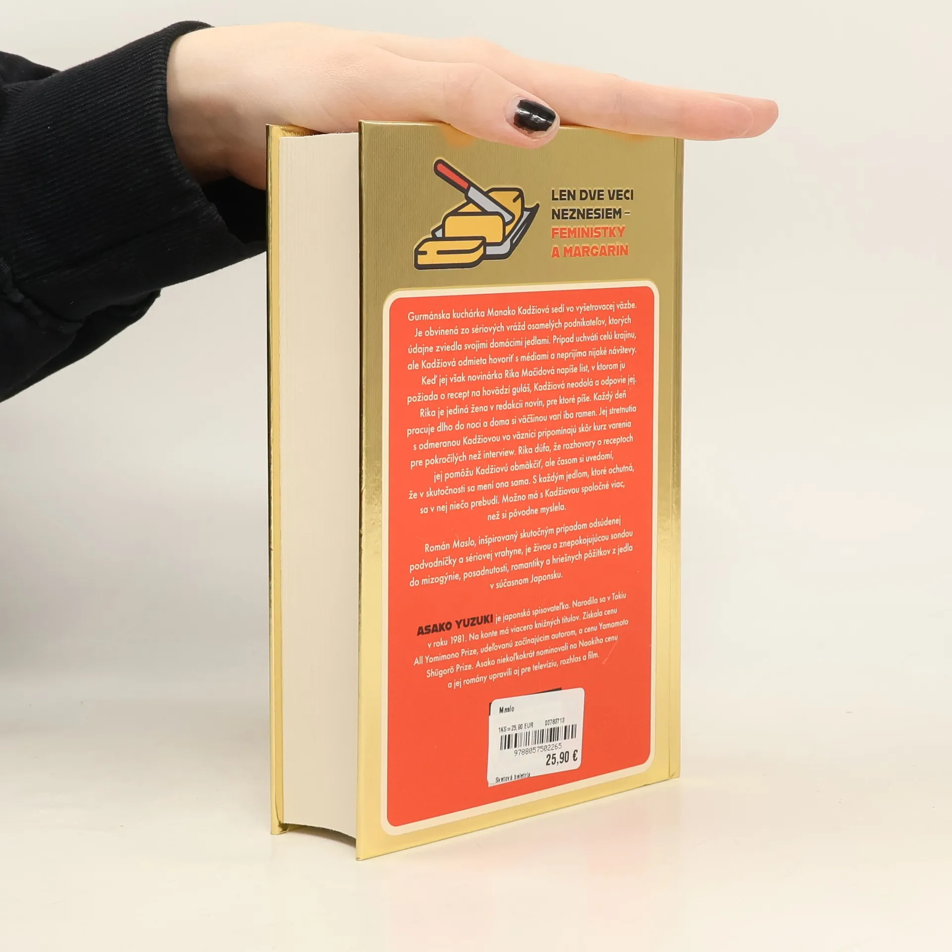 Japonský bestseller inšpirovaný skutočným príbehom sériovej vrahyne Len dve veci neznesiem ? feministky a margarín Gurmánska kuchárka Manako Kadžiová sedí vo vyšetrovacej väzbe. Je obvinená zo sériových vrážd osamelých podnikateľov, ktorých údajne zviedla svojimi domácimi jedlami. Prípad uchváti celú krajinu, ale Kadžiová odmieta hovoriť s médiami a neprijíma nijaké návštevy. Keď jej však novinárka Rika Mačidová napíše list, v ktorom ju požiada o recept na hovädzí guláš, Kadžiová neodolá a odpovie jej. Rika je jediná žena v redakcii novín, pre ktoré píše. Každý deň pracuje dlho do noci a doma si väčšinou varí iba ramen. Jej stretnutia s odmeranou Kadžiovou vo väznici pripomínajú skôr kurz varenia pre pokročilých než interview. Rika dúfa, že rozhovory o receptoch jej pomôžu Kadžiovú obmäkčiť, ale prekvapená si uvedomí, že v skutočností sa mení ona sama. S každým jedlom, ktoré ochutná, sa v nej niečo prebudí. Možno má s Kadžiovou spoločné viac, než si pôvodne myslela. Román Maslo, inšpirovaný skutočným prípadom odsúdenej podvodníčky a sériovej vrahyne, je živou a znepokojujúcou sondou do mizogýnie, posadnutosti, romantiky a hriešnych pôžitkov z jedla v súčasnom Japonsku.