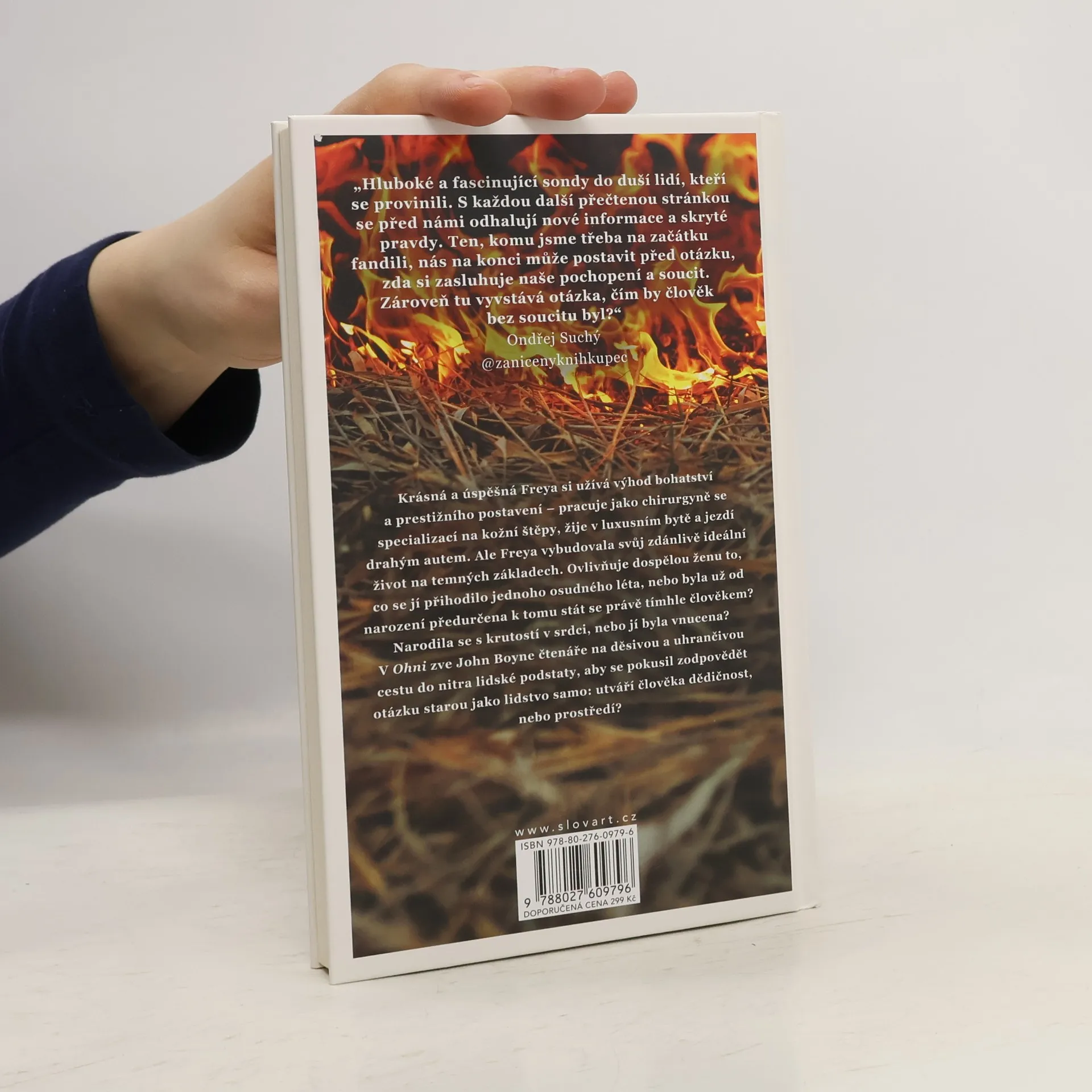 Krásná a úspěšná Freya si užívá výhod bohatství a prestižního postavení - pracuje jako chirurgyně se specializací na kožní štěpy, žije v luxusním bytě a jezdí drahým autem. Ale Freya vybudovala svůj zdánlivě ideální život na temných základech. Ovlivňuje dospělou ženu to, co se jí přihodilo jednoho osudného léta, nebo byla už od narození předurčena k tomu stát se právě tímhle člověkem? Narodila se s krutostí v srdci, nebo jí byla vnucena? V Ohni zve John Boyne čtenáře na děsivou a uhrančivou cestu do nitra lidské podstaty, aby se pokusil zodpovědět otázku starou, jako lidstvo samo: utváří člověka dědičnost, nebo prostředí?