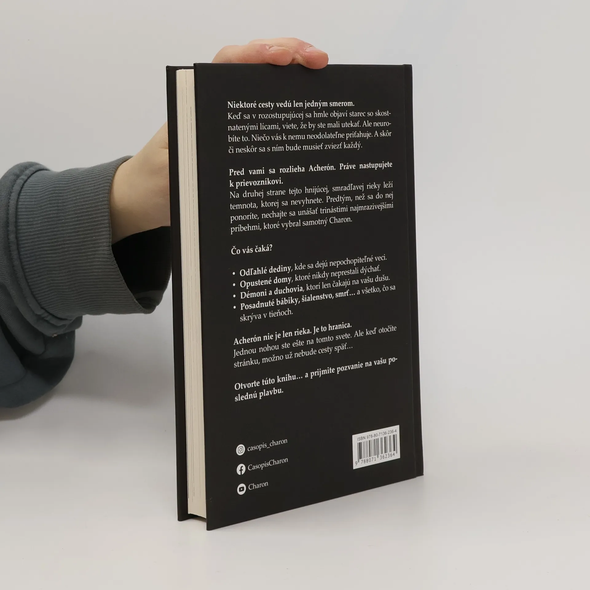Niektoré cesty vedú len jedným smerom.Keď sa v rozostupujúcej sa hmle objaví starec so skostnatenými lícami, viete, že by ste mali utekať. Ale neurobíte to. Niečo vás k nemu neodolateľne priťahuje. A skôr či neskôr sa s ním bude musieť zviezť každý.Pred vami sa rozlieha Acherón. Práve nastupujete k prievozníkovi.Na druhej strane tejto hnijúcej, smradľavej rieky leží temnota, ktorej sa nevyhnete. Predtým, než sa do nej ponoríte, nechajte sa unášať trinástimi najmrazivejšími príbehmi, ktoré vybral samotný Charon.Čo vás čaká?•Odľahlé dediny, kde sa dejú nepochopiteľné veci.•Opustené domy, ktoré nikdy neprestali dýchať.•Démoni a duchovia, ktorí len čakajú na vašu dušu.•Posadnuté bábiky, šialenstvo, smrť… a všetko, čo sa skrýva v tieňoch.Acherón nie je len rieka. Je to hranica.Jednou nohou ste ešte na tomto svete. Ale keď otočíte stránku, možno už nebude cesty späť…Otvorte túto knihu… a prijmite pozvanie na vašu poslednú plavbu.