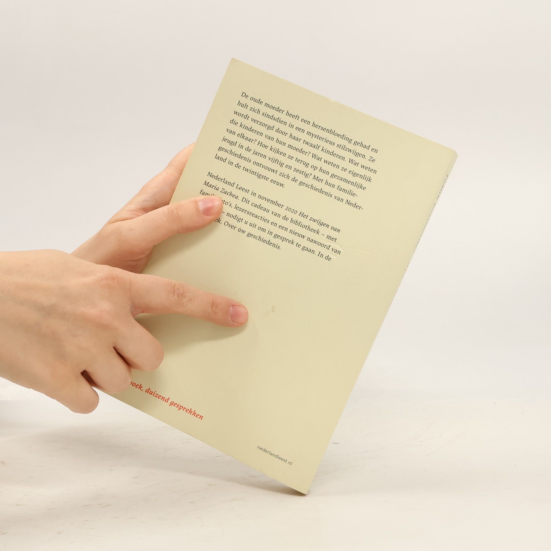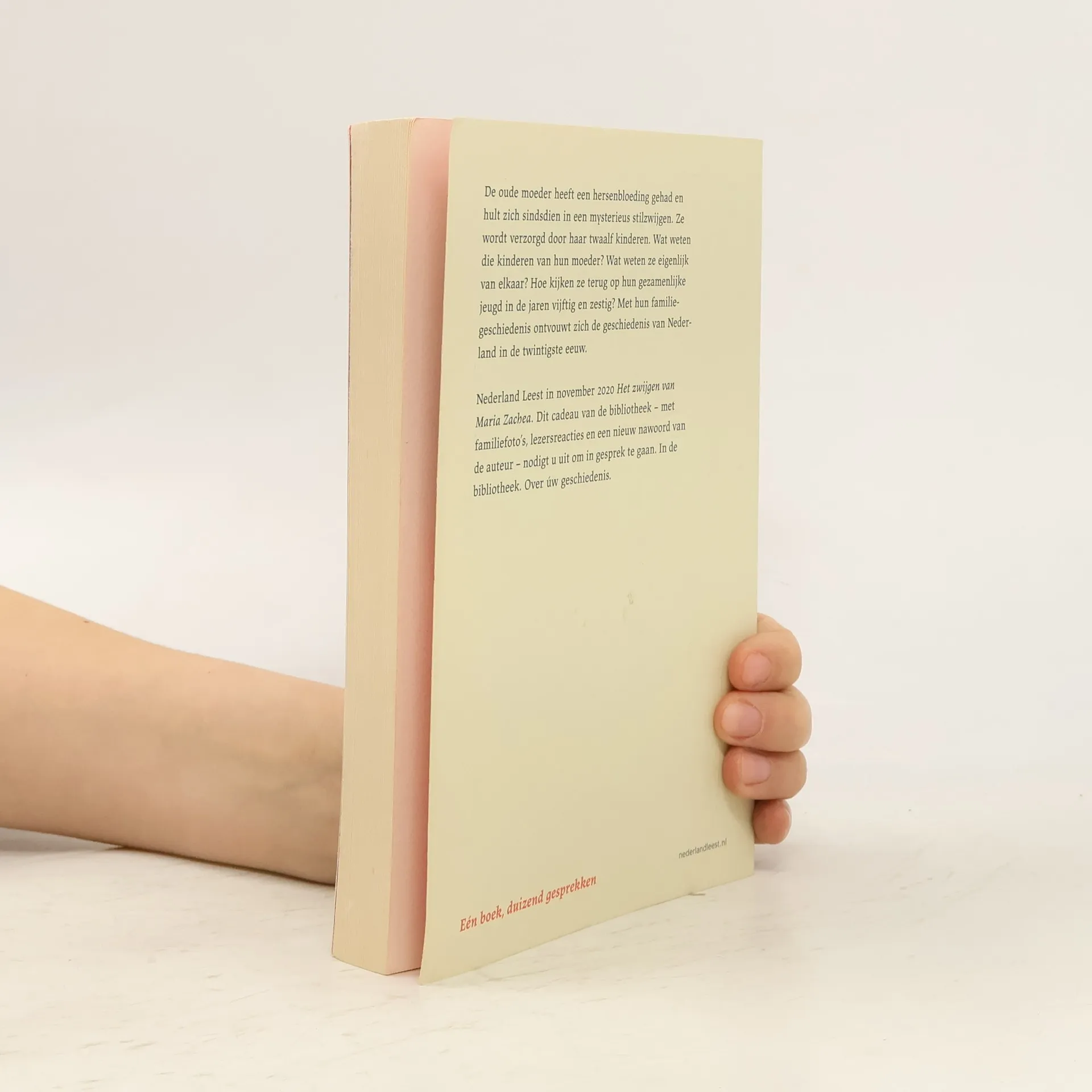 De oude moeder heeft een hersenbloeding gehad en hult zich sindsdien in een mysterieus stilzwijgen. Ze wordt verzorgd door haar twaalf kinderen. Wat weten die kinderen van hun moeder? Wat weten ze eigenlijk van elkaar? Hoe kijken ze terug op hun gezamenlijke jeugd in de jaren vijftig en zestig? Met hun familiegeschiedenis ontvouwt zich de geschiedenis van Nederland in de twintigste eeuw. Nederland Leest in november 2020 Het zwijgen van Maria Zachea . Dit cadeau van de bibliotheek - met familiefoto's, lezersreacties en een nieuw voorwoord van de auteur - nodigt u uit om in gesprek te gaan. In de bibliotheek. Over úw geschiedenis.