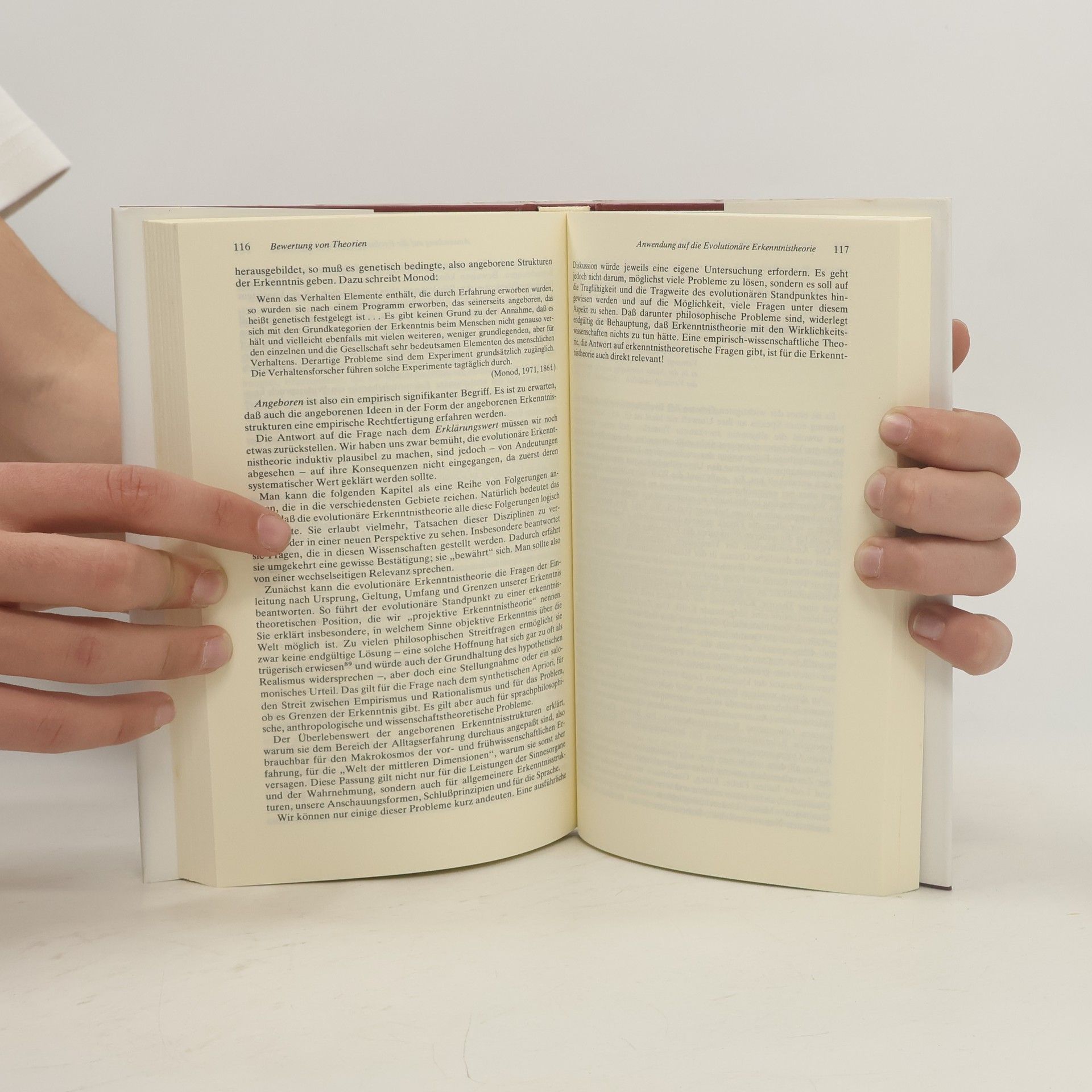 Dass wir die Welt erkennen können, ist nach der Evolutionären Erkenntnistheorie weder Zufall noch göttliche Fügung, sondern auf natürliche Weise erklärbar. Denken und Erkennen sind Leistungen des menschlichen Gehirns. Unsere kognitiven Strukturen passen auf unsere Welt, weil sie sich in Anpassung an diese Welt herausgebildet haben. Diese Passung ist nicht ideal, aber ausreichend für das Überleben unter Konkurrenz. Gerhard Vollmer hat die Evolutionäre Erkenntnistheorie massgebend mitentwickelt. In seinem Standardwerk erklärt er die Leistungen und Fehlleistungen unseres Erkenntnisapparates.