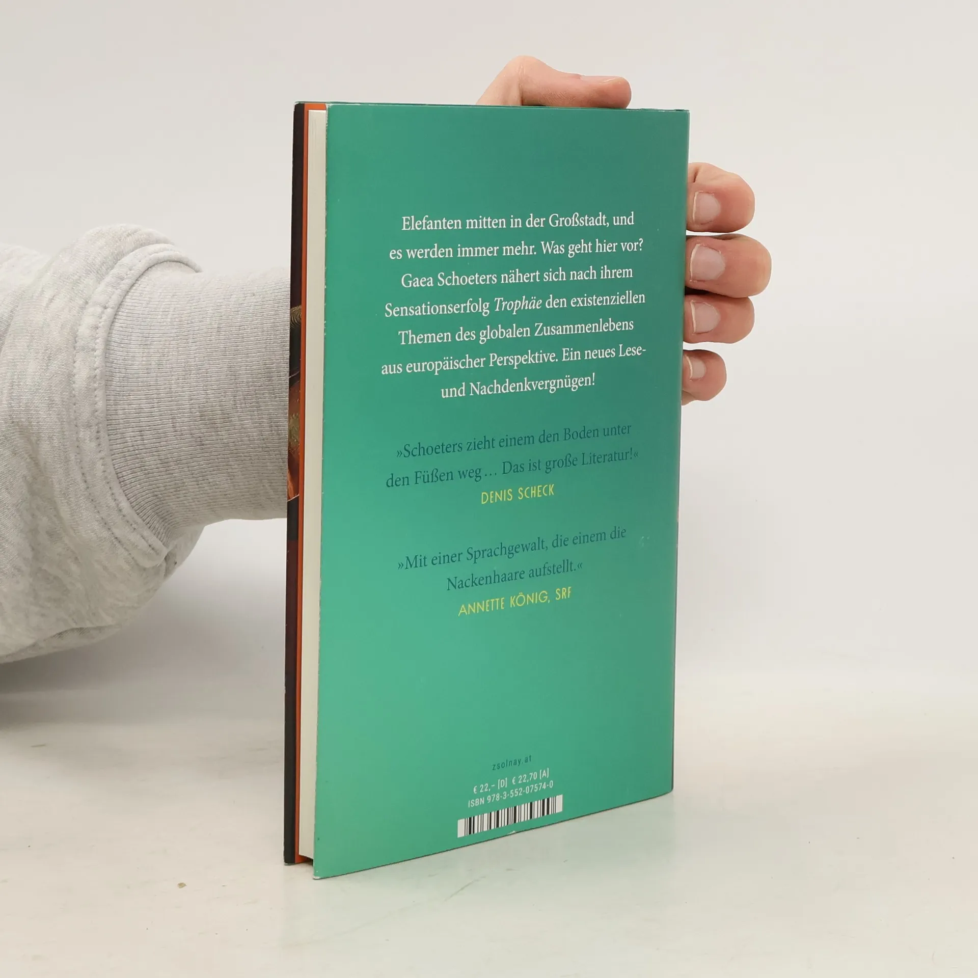Nach »Trophäe« der neue Roman von Gaea Schoeters – über die unausweichlichen globalen Fragen aus europäischer PerspektiveElefanten mitten in der Großstadt, und es werden immer mehr. Was geht hier vor? Rasch muss der Bundeskanzler erkennen, dass die Tiere nicht aus dem Zoo entkommen, sondern ein Geschenk des Präsidenten von Botswana sind. 20 000 Elefanten hat er nach Deutschland geschickt, nachdem die deutsche Regierung ein Einfuhrverbot von Jagdtrophäen beschlossen und damit den armen Regionen Botswanas die Lebensgrundlage entzogen hat. »Ihr Europäer wollt uns vorschreiben, wie wir zu leben haben. Vielleicht solltet ihr es einmal selbst versuchen …«Gaea Schoeters nähert sich nach ihrem Sensationserfolg »Trophäe« den existenziellen Themen des globalen Zusammenlebens aus einer anderen Richtung – und mit blitzgescheitem Humor. Ein neues Lese- und Nachdenkvergnügen!