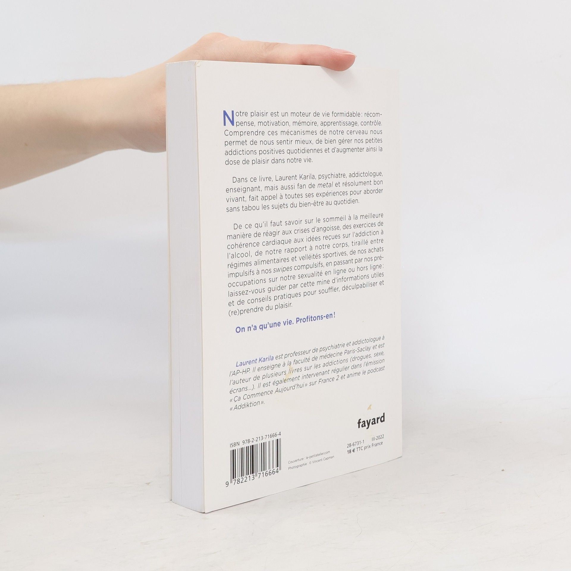 Notre plaisir est un moteur de vie formidable : récompense, motivation, mémoire, apprentissage, contrôle. Comprendre ces mécanismes de notre cerveau nous permet de nous sentir mieux, de bien gérer nos petites addictions positives quotidiennes et d’augmenter ainsi la dose de plaisir dans notre vie.Dans ce livre, Laurent Karila, psychiatre, addictologue, enseignant, mais aussi fan de metal et résolument bon vivant, fait appel à toutes ses expériences pour aborder sans tabou les sujets du bien-être au quotidien.De ce qu’il faut savoir sur le sommeil à la meilleure manière de réagir aux crises d’angoisse, des exercices de cohérence cardiaque aux idées reçues sur l’addiction à l’alcool, de notre rapport à notre corps, tiraillé entre régimes alimentaires et velléités sportives, de nos achats impulsifs à nos swipes compulsifs, en passant par nos préoccupations sur notre sexualité en ligne ou hors ligne : laissez-vous guider par cette mine d’informations utiles et de conseils pratiques pour souffler, déculpabiliser et (re)prendre du plaisir.On n’a qu’une vie. Profitons-en !Laurent Karila est professeur de psychiatrie et addictologue à l’AP-HP. Il enseigne à la faculté de médecine Paris-Saclay et est l’auteur de plusieurs livres sur les addictions (drogues, sexe, écrans…). Il est également intervenant régulier dans l’émission « Ça Commence Aujourd’hui » sur France 2 et anime le podcast « Addiktion