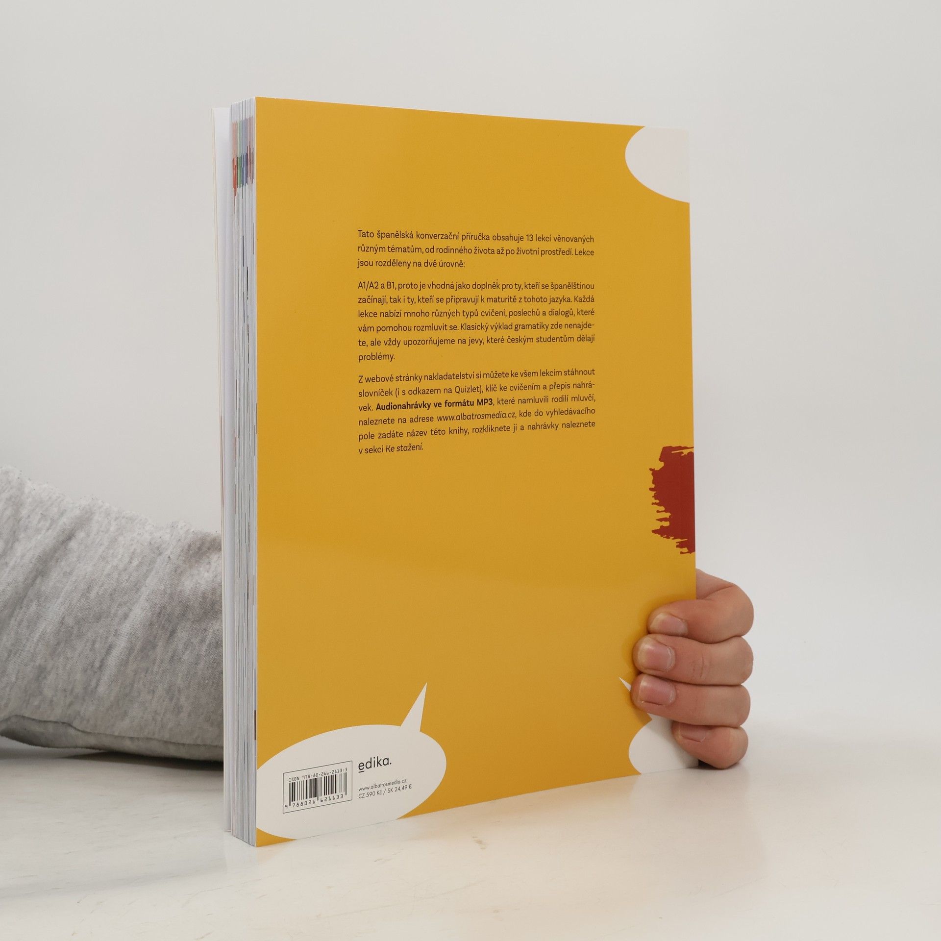 Tato španělská konverzační příručka obsahuje 13 lekcí věnovaných různým tématům, od rodinného života až po životní prostředí. Lekce jsou rozděleny na dvě úrovně: A1/A2 a B1, proto je vhodná jako doplněk pro ty, kteří se španělštinou začínají, tak i ty, kteří se připravují k maturitě z tohoto jazyka. Každá lekce nabízí mnoho různých typů cvičení, poslechů a dialogů, které vám pomohou rozmluvit se. Klasický výklad gramatiky zde nenajdete, ale vždy upozorňujeme na jevy, které českým studentům dělají problémy. Z webové stránky nakladatelství si můžete ke všem lekcím stáhnout slovníček (i s odkazem na Quizlet), klíč ke cvičením a přepis nahrávek.