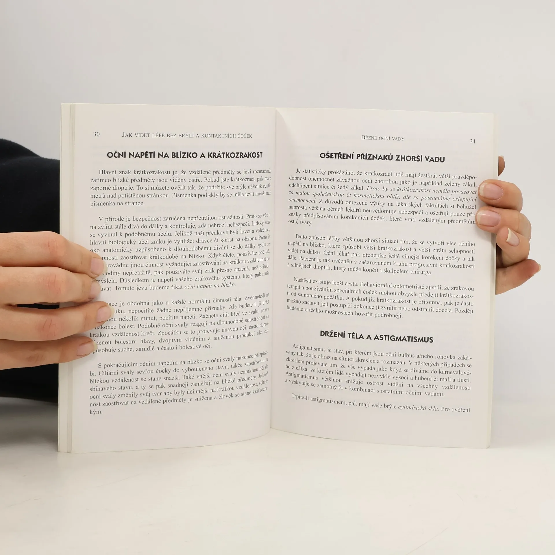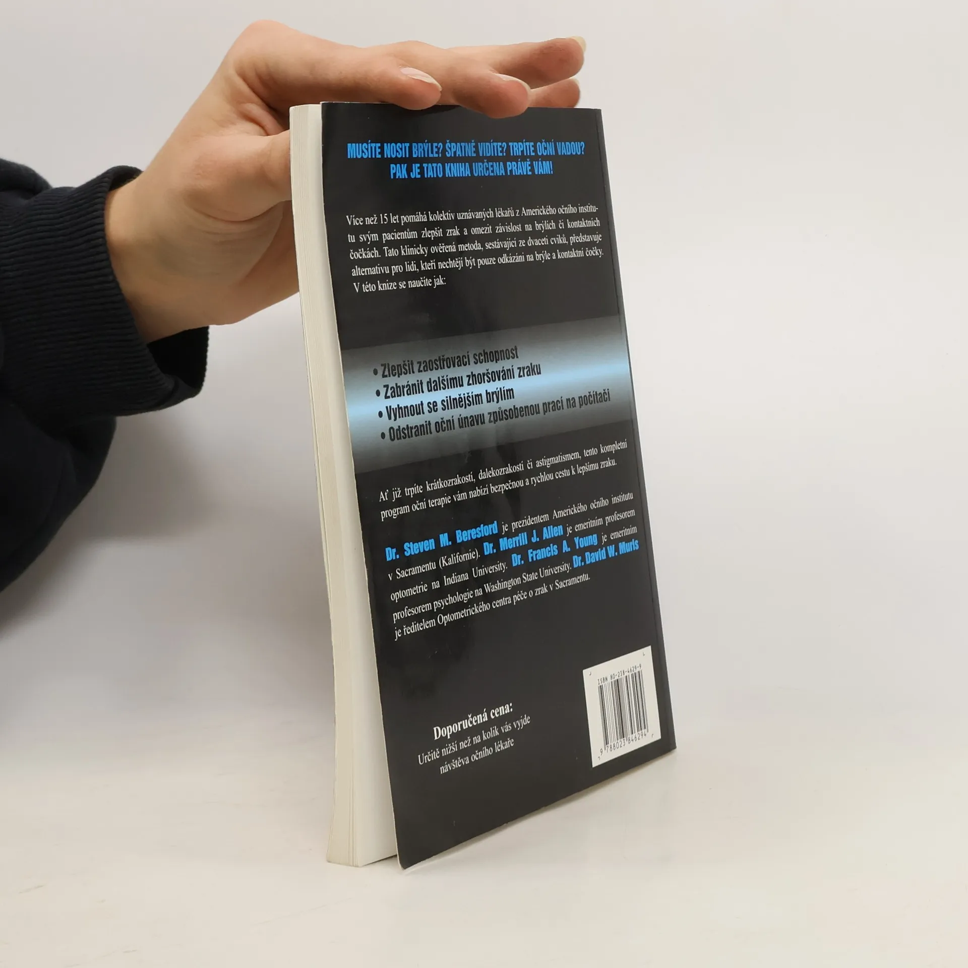 Oční cviky pro každého. Nový léčebný program sestaven kolektivem lékařů z Amerického očního institutu v Kalifornii. Musíte nosit brýle? Špatně vidíte? Trpíte oční vadou? Pak je tato kniha určena právě Vám! Více než 15 let pomáhá kolektiv uznávaných lékařů z Amerického očního institutu svým pacientům zlepšit zrak a omezit závislost na brýlích či kontaktních čočkách. Tato klinicky ověřená metoda, sestávající ze dvaceti cviků, představuje alternativu pro lidi, kteří nechtějí být pouze odkázáni na brýle a kontaktní čočky. V této knize se naučíte jak: Zlepšit zaostřovací schopnost, zabránit dalšímu zhoršování zraku, vyhnout se silnějším brýlím, odstranit oční únavu způsobenou prací na počítači. Ať již trpíte krátkozrakostí, dalekozrakostí či astigmatismem, tento kompletní program oční terapie vám nabízí bezpečnou a rychlou cestu k lepšímu zraku.
