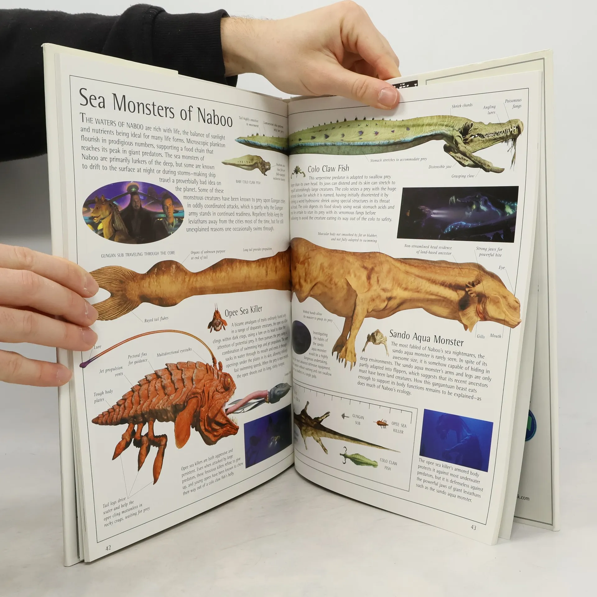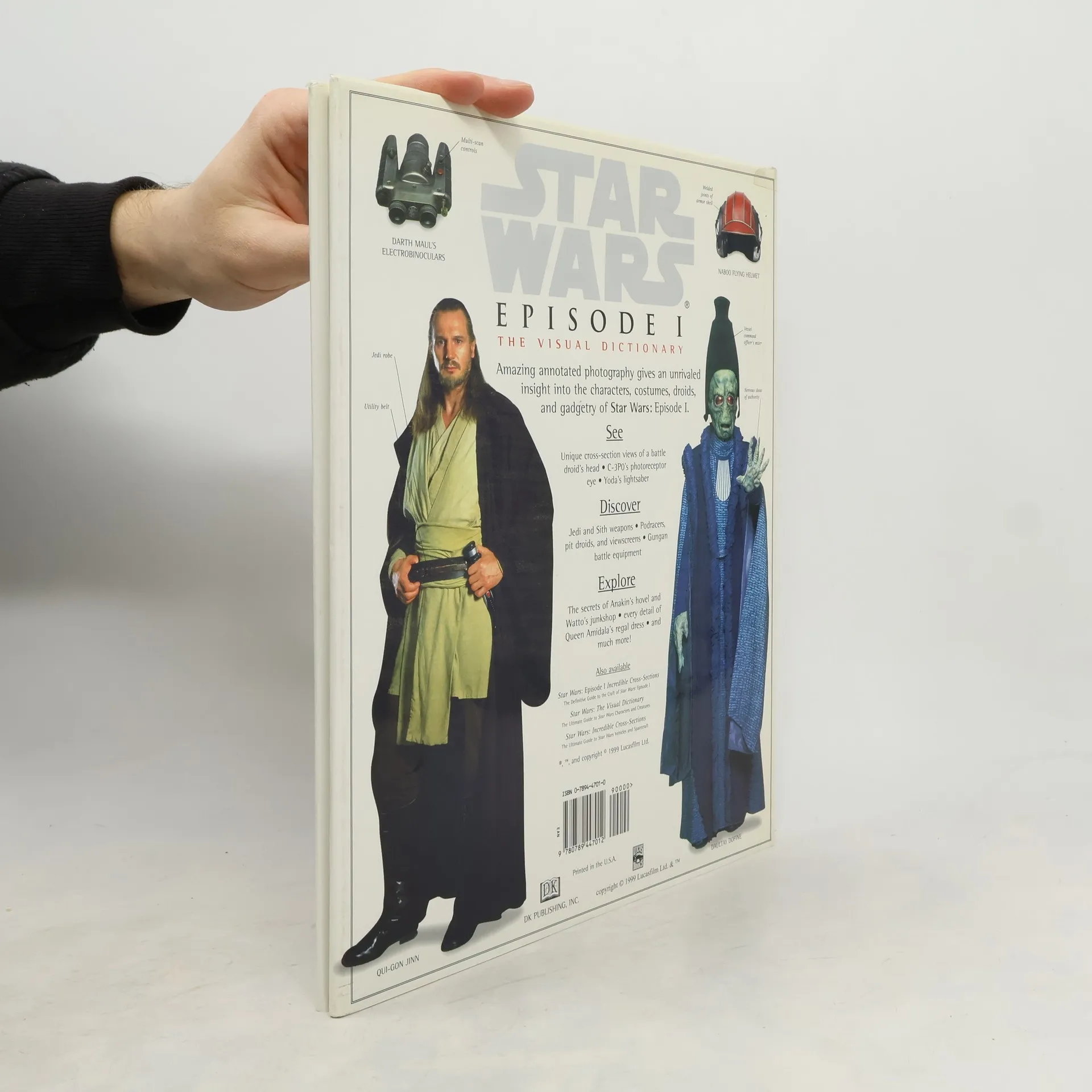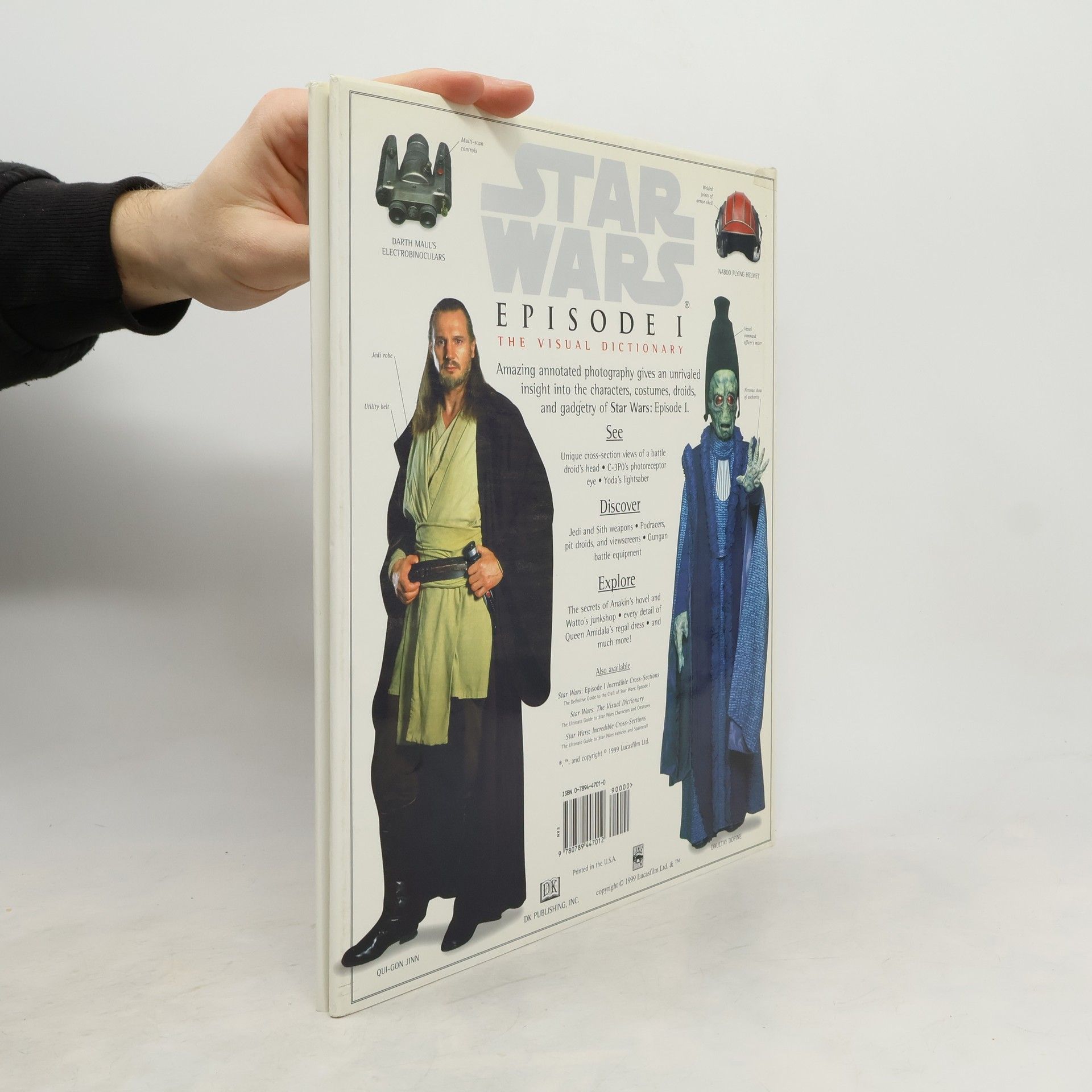 Text and illustrations present characters from episode I of "Star Wars" and the technology they use, including Qui-Gon Jinn and his wrist hologram projector, the space freighters of the Nemoidians, and the lightsabers of the Jedi Knights.