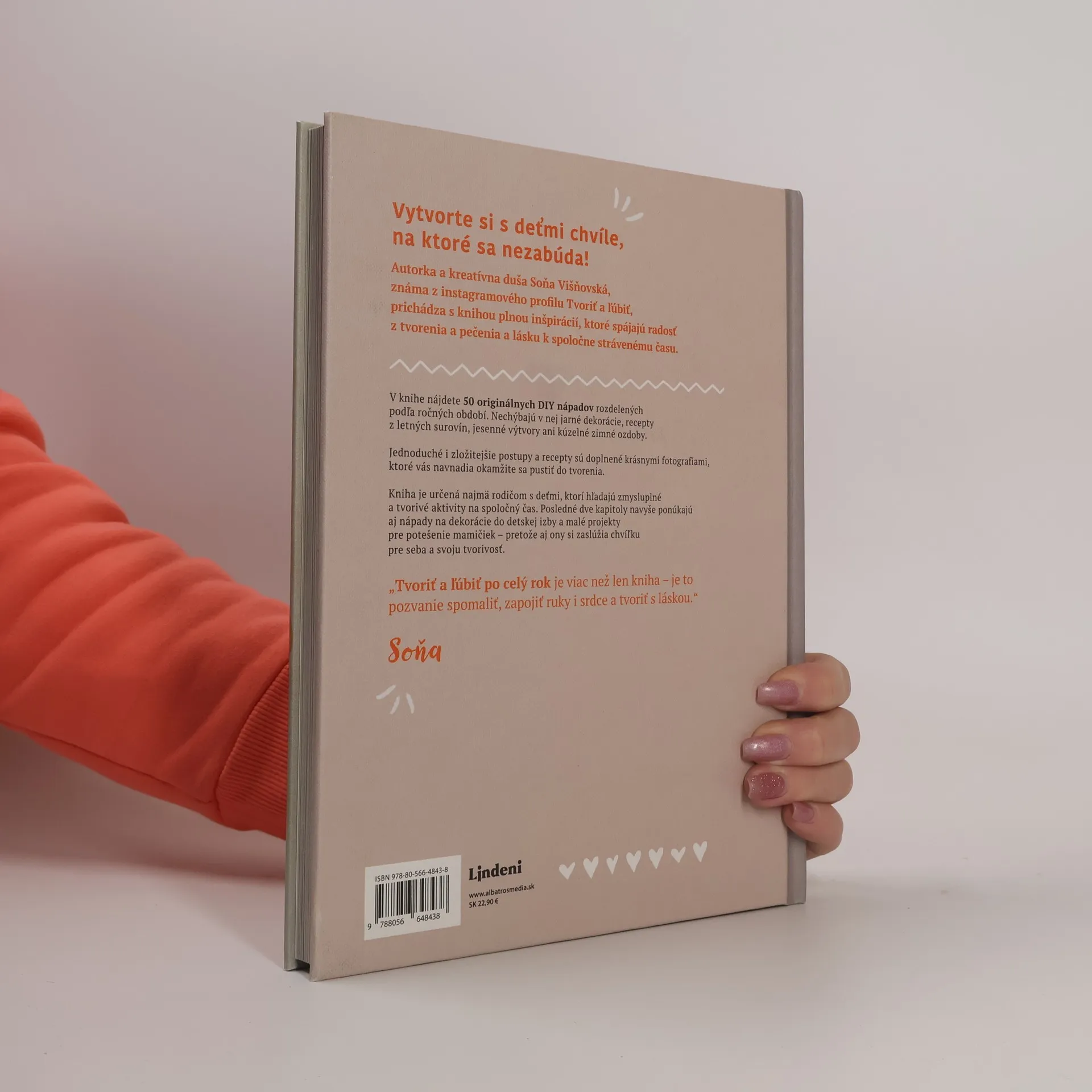 Kniha plná kreatívnych nápadov od hviezdy sociálnych sietí Sone VišňovskejKreatívna duša Soňa Višňovská, známa z instagramového profilu Tvoriť a ľúbiť, prichádza s knihou plnou inšpirácií, ktoré spájajú radosť z tvorenia a lásku k spoločne strávenému času. V knihe nájdete 50 originálnych DIY nápadov na celý rok. Nechýbajú v nej jarné dekorácie, recepty z letných surovín, jesenné výtvory ani kúzelné zimné ozdoby, no taktiež dekorácie do detskej izby a projekty pre potešenie mamičiek. Postupy a recepty dopĺňajú krásne fotografie, ktoré vás navnadia okamžite sa pustiť do tvorenia!