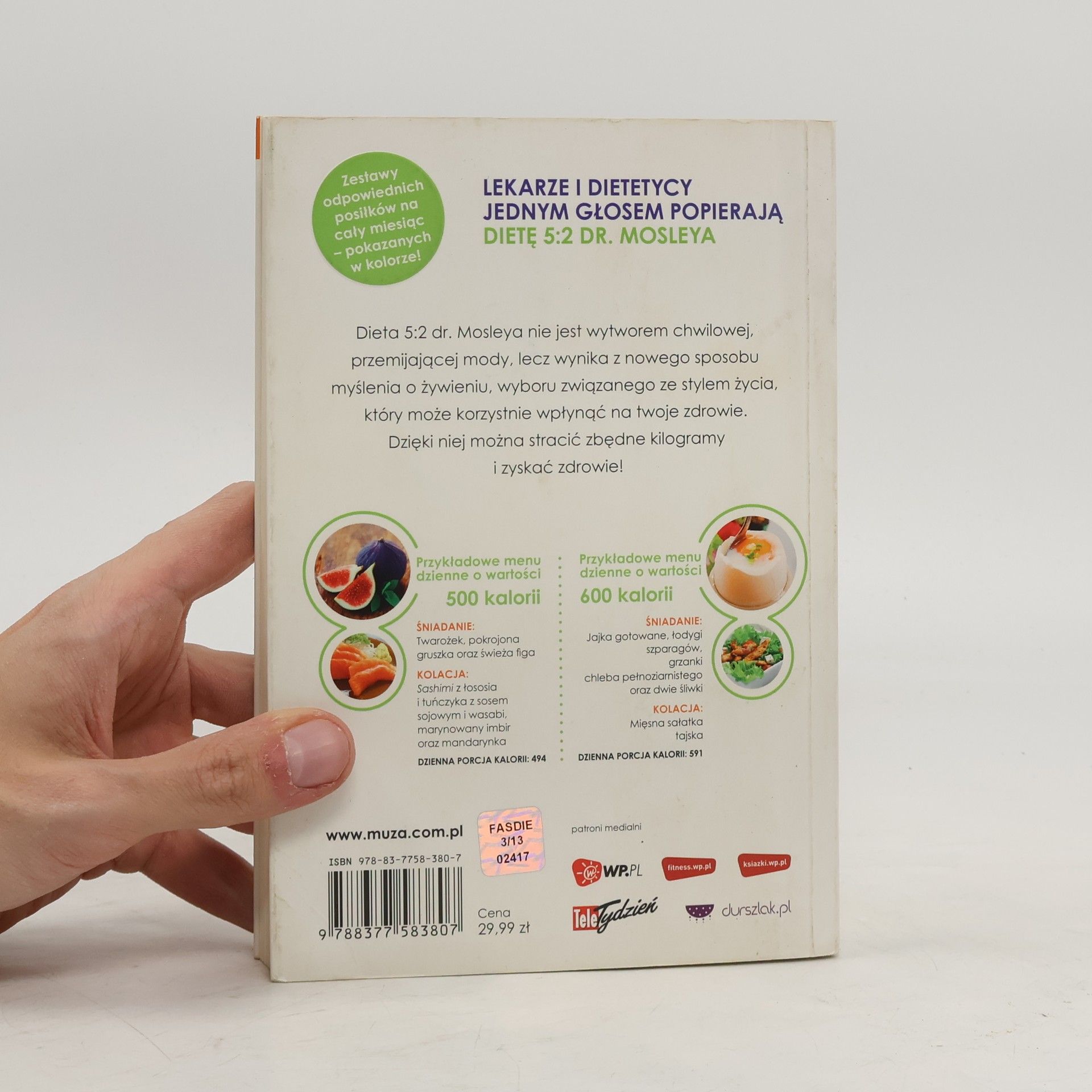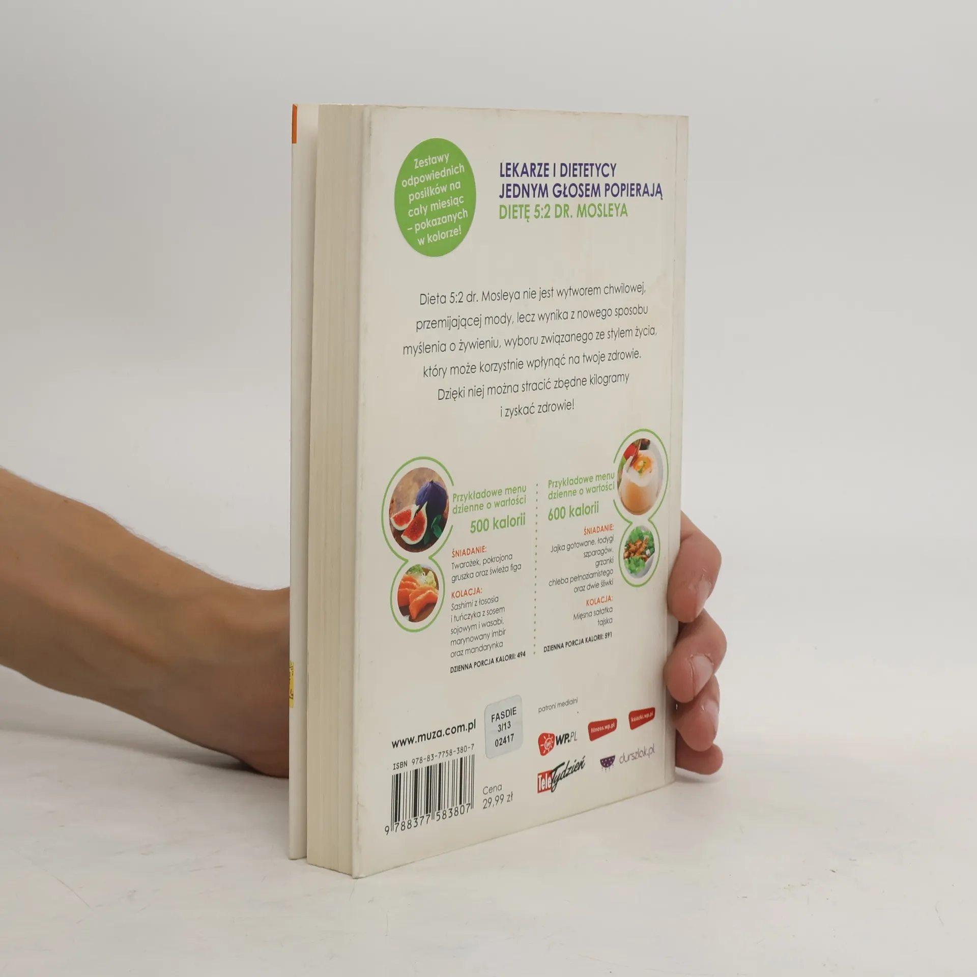 Dołącz do grona szczupłych i zdrowych ludzi, sięgając po przepisy diety 5:2 dr. Mosleya! Niezbędne uzupełnienie DIETY 5:2 DR. MOSLEYA – bestsellera „New York Timesa” i Amazona! Dieta, której zaufali specjaliści i miliony czytelników! Ta książka kucharska stanowi bardzo praktyczny dodatek i zarazem przewodnik po Diecie 5:2 dr. Mosleya, która zdążyła już podbić serca polskich czytelników. Znajduje się tu ponad 150 wyjątkowych, starannie opracowanych przepisów na pożywne, niskokaloryczne dania. Są przepisy potraw na śniadanie, kolacje, te całkiem proste i wręcz wykwintne. Przedstawione sycące potrawy mięsne i smakowite dania rybne pozwolą zaspokoić głód, a przy tym nie przekroczyć limitu 500/600 kalorii. Zawarte tu propozycje jadłospisów na cały dzień oraz liczne cenne rady, motywują do przestrzegania diety dr. Mosleya. Dzięki tej książce planowanie posiłków na kluczowe dwa dni w tygodniu staje się banalnie proste!