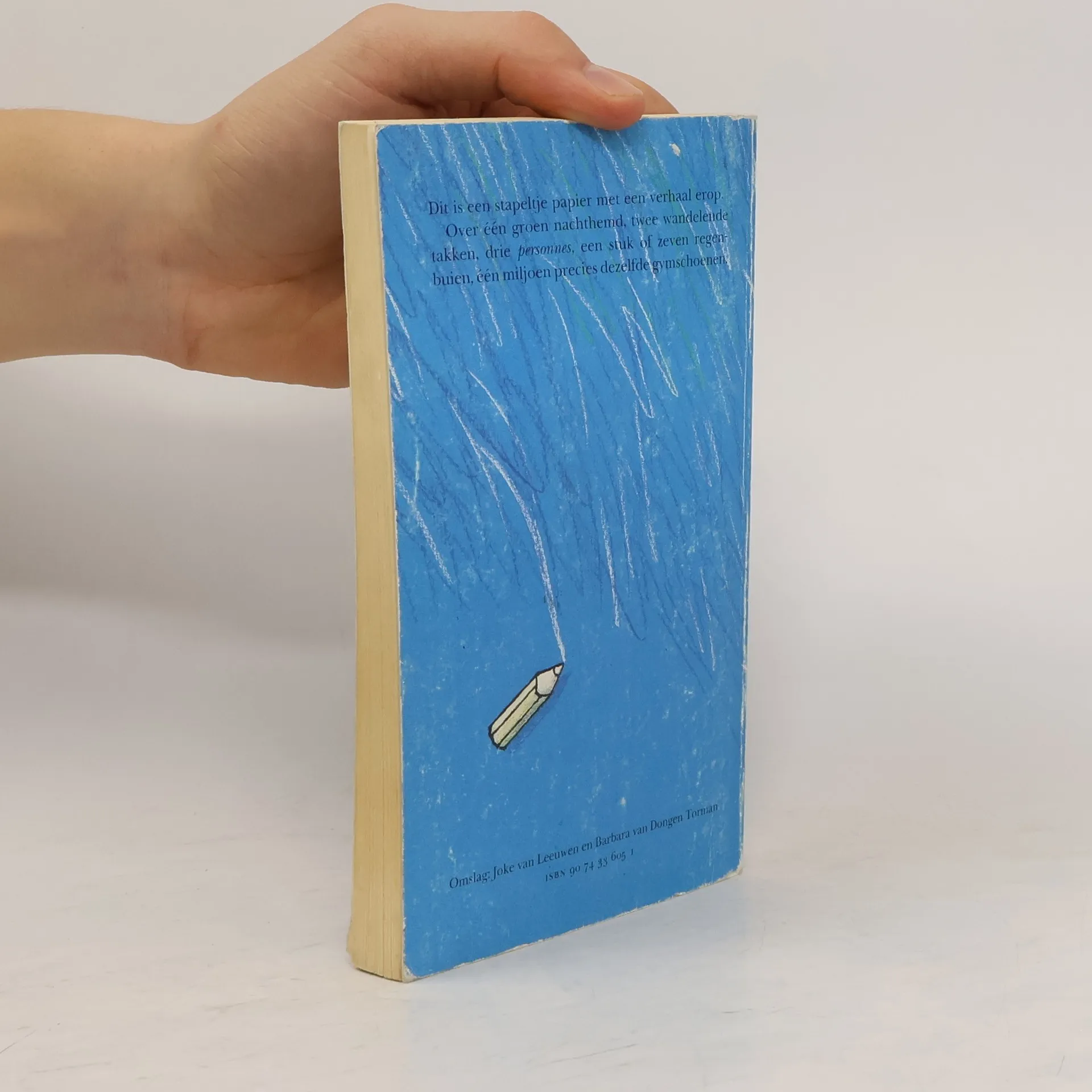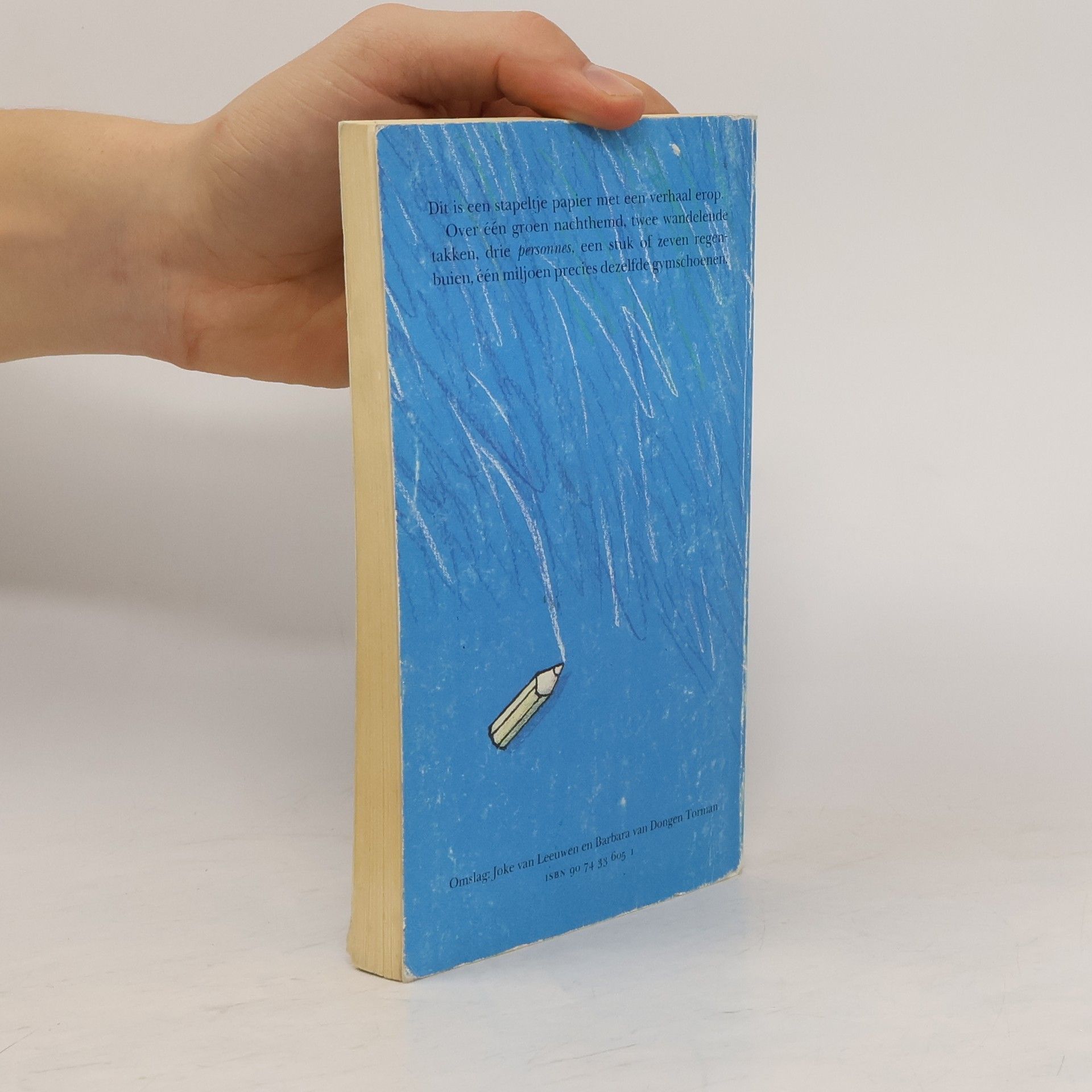Dit is een stapeltje papier met een verhaal erop.Over één groen nachthemd, twee wandelende takken, drie personnes, een stuk of zeven regenbuien, één miljoen precies dezelfde gymschoenen.